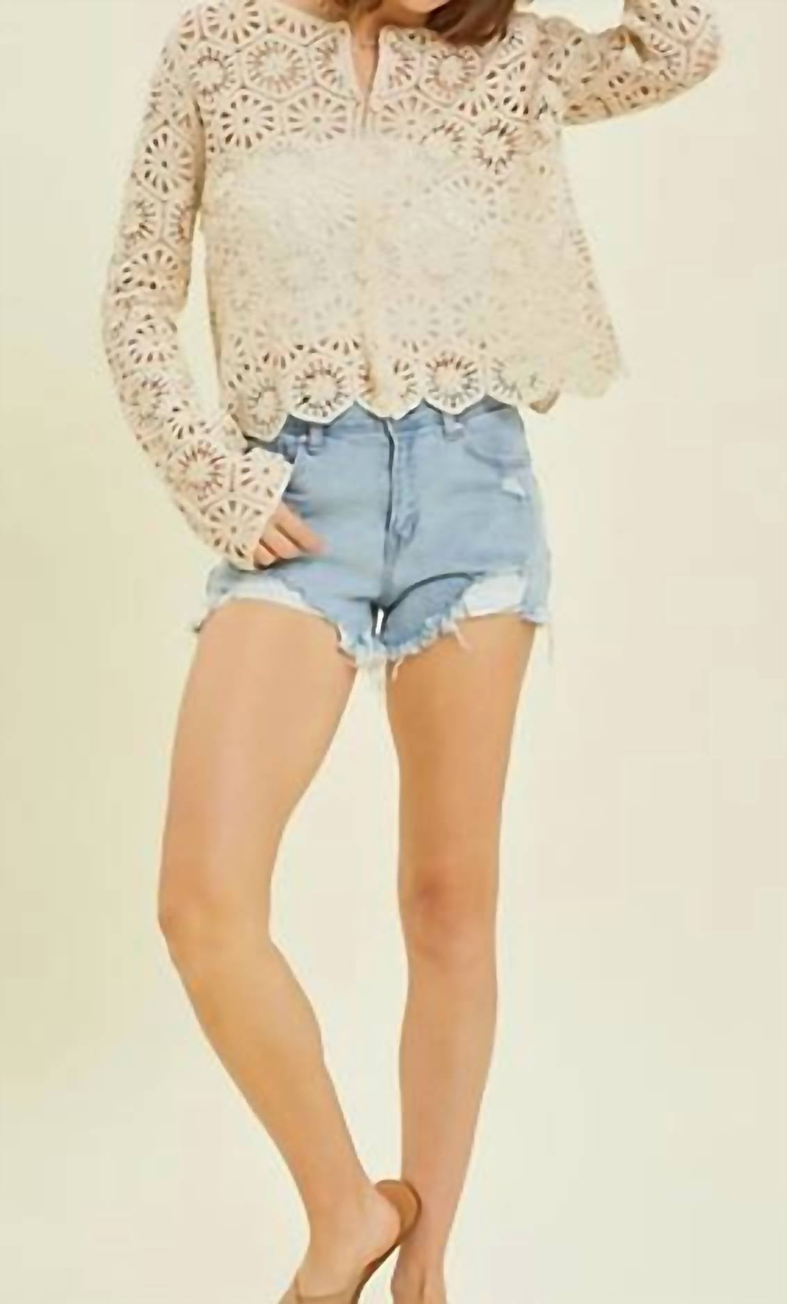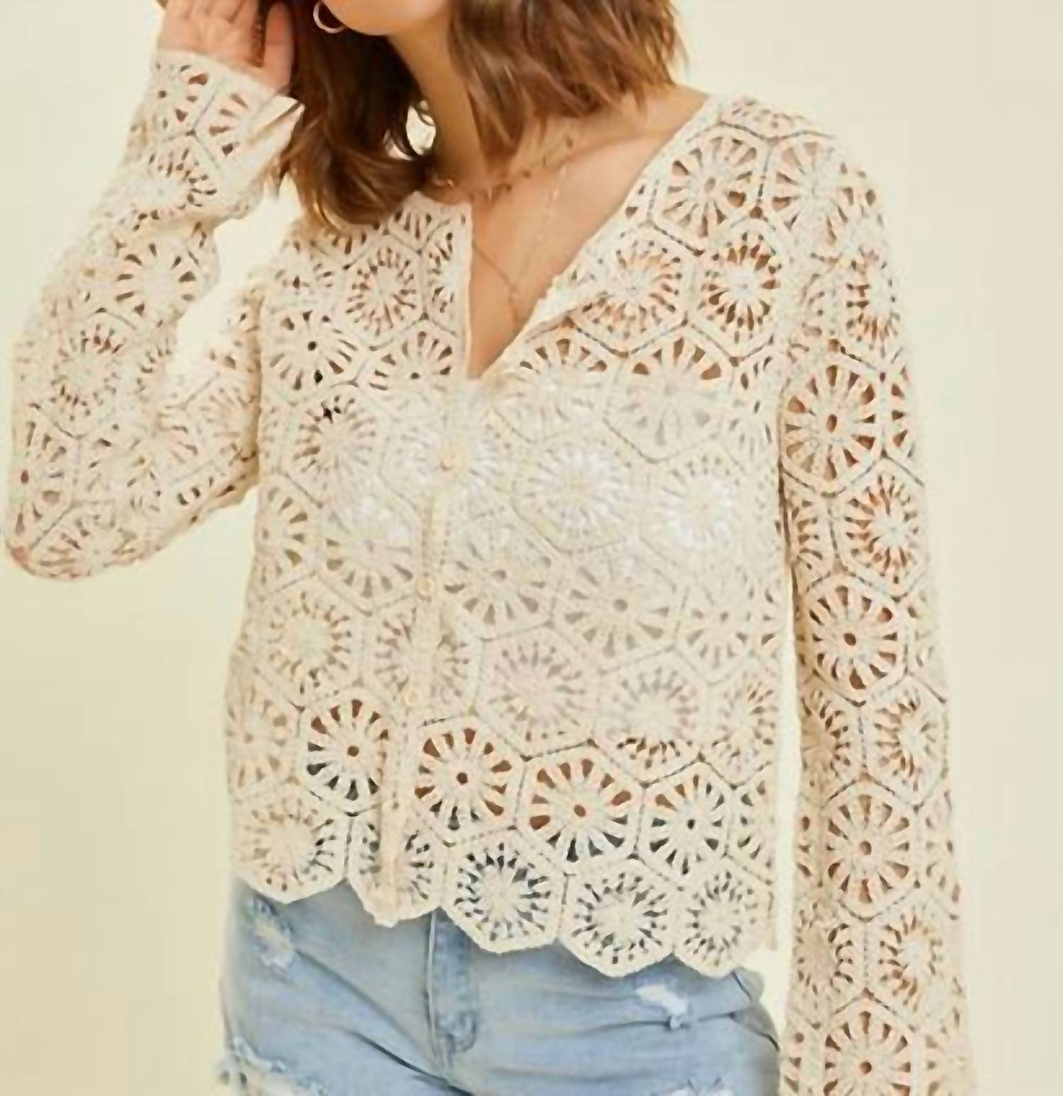 This cardigan will be a sweater-rotation favorite. Must-have for your Fall wardrobe. Oatmilk-hued cardigan boasts a trendy Boho Chic vibe with its long sleeves and crewneck design. Features a patterned crochet lace composition, specially crafted for women who seek style on their travels. Button closure. Hand wash recommended.
