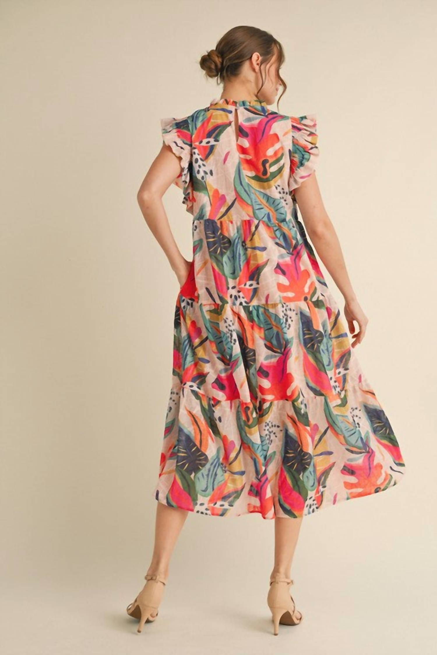 A midi dress so versatile, your options for wearing it are endless. Elevate your vacation wardrobe with the Tropical Print Ruffle Sleeve Midi Dress by Jodifl, a vibrant addition to any closet. This women's dress, rendered in a pink multi pattern, features playful cap sleeves and an off-the-shoulder neckline, enhancing its Maximalist appeal. Crafted from a nylon blend composing 60% Polyester, and 40% Nylon, the A-line silhouette is both chic and comfortable, complete with convenient pockets and a button closure. Designed with care in mind, wash by hand and line dry to maintain its lively print.