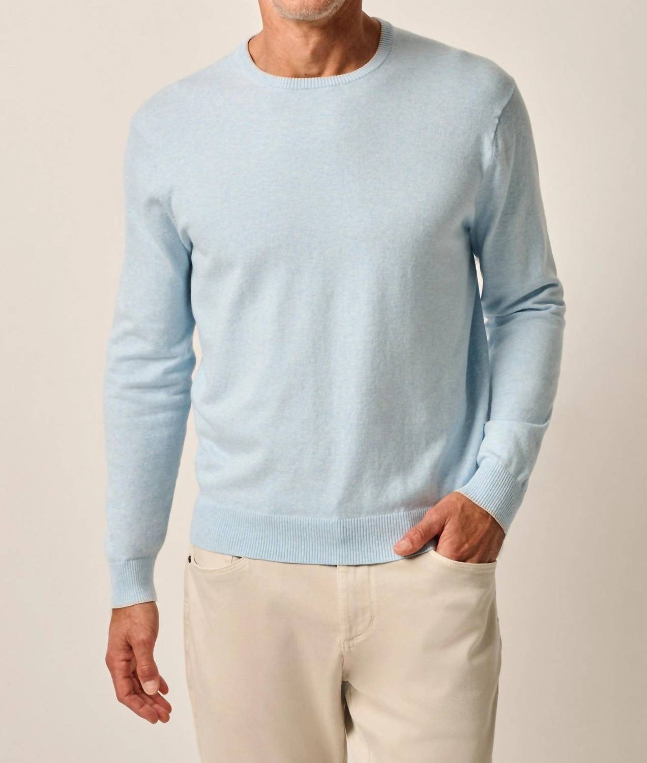 The Wren Crewneck Sweater by JOHNNIE-O is a stylish addition to your fall wardrobe, crafted from a cotton blend for a soft and comfortable feel. It features long sleeves, ribbed cuffs, neck, and a unique whistle stop detail, all enhanced by contrast striping. The Maliblu color sets a modern tone, complemented by a tonal Surfer dude on the center back yoke. This pull-on sweater should be hand washed and laid flat to dry, making it ideal for minimalist, vacation occasions.