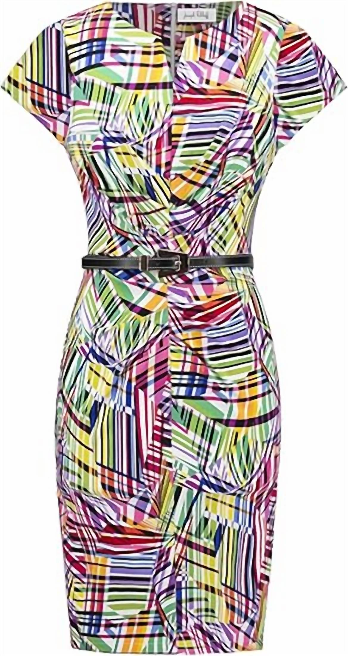 A short and breezy dress for those warmer days. Elevate your wardrobe with this striking dress, featuring a vibrant abstract print and an unconventional design. Crafted from ultra-comfortable Millennium fabric, this piece showcases a boat neck with a chic slit, a faux croc belt with a gold triangular buckle, and artful tucks down the center front for added depth. A true visual statement, this dress is as fun to wear as it is stylish.
