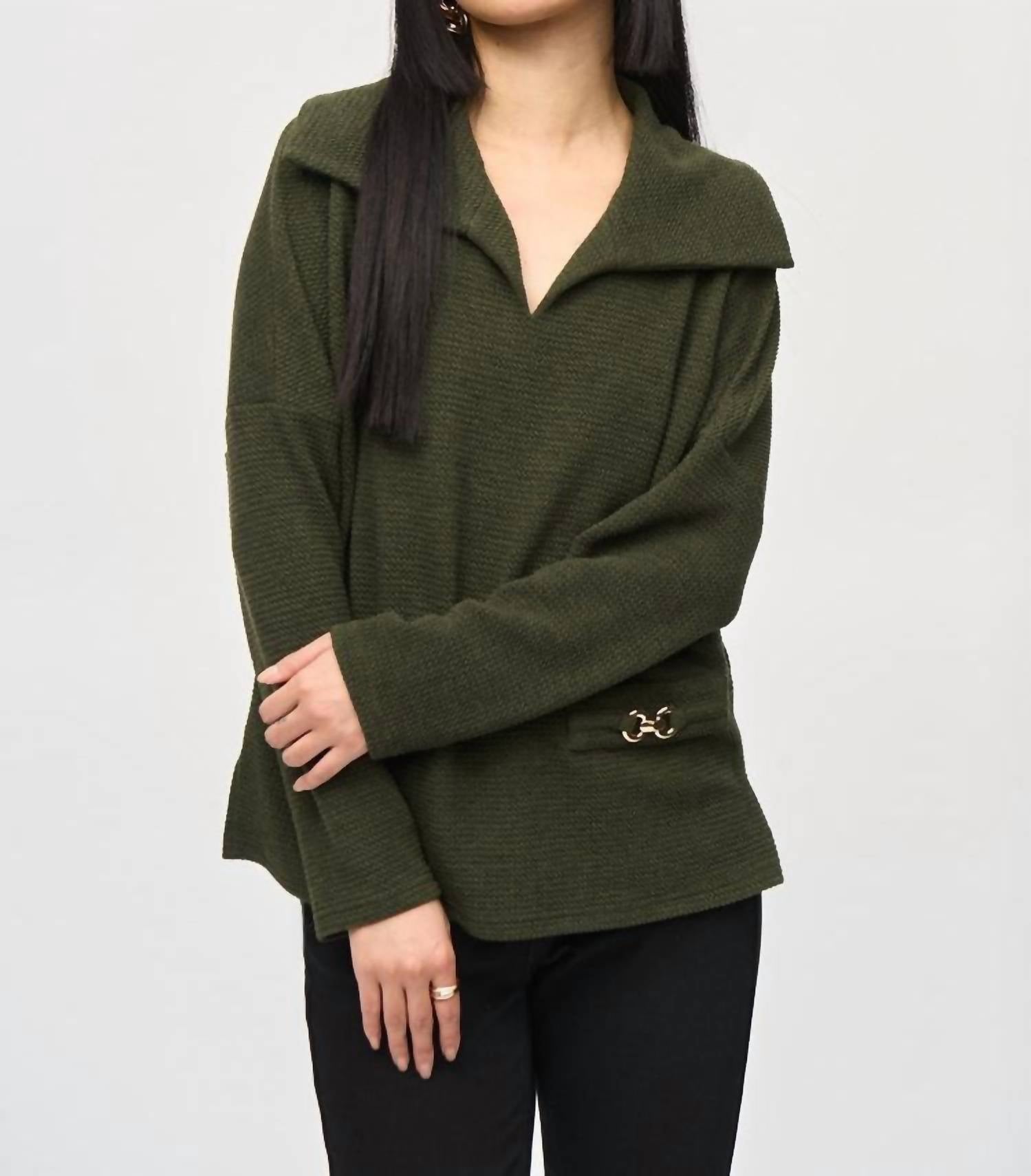 You'll be reaching for this comfy and classic v-neck sweater all season long. Introducing the Joseph Ribkoff Textured Sweater Knit Boxy Top in Iguana, where comfort meets contemporary style. This women's V-neck top features long dolman sleeves and is made from a blend of 81% polyester, 15% viscose rayon, and 4% spandex for a textured knit finish. With a sleek pull-on design and an elegant funnel collar, it offers a polished look. Care for it by hand washing in cold water with like colors and drying flat in the shade; do not tumble dry or iron.