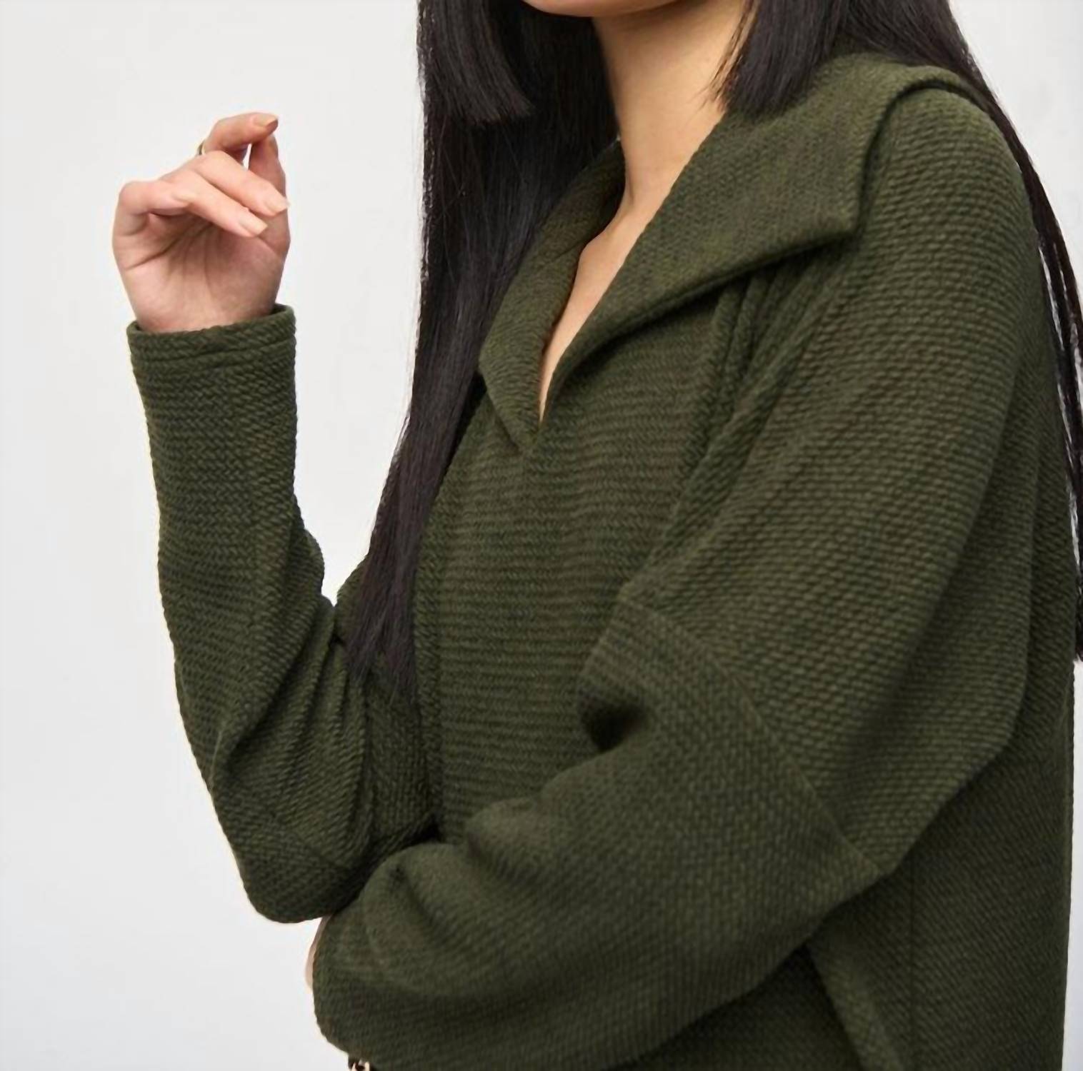 Introducing the Joseph Ribkoff Textured Sweater Knit Boxy Top in Iguana, where comfort meets contemporary style. This women's V-neck top features long dolman sleeves and is made from a blend of 81% polyester, 15% viscose rayon, and 4% spandex for a textured knit finish. With a sleek pull-on design and an elegant funnel collar, it offers a polished look. Care for it by hand washing in cold water with like colors and drying flat in the shade; do not tumble dry or iron.
