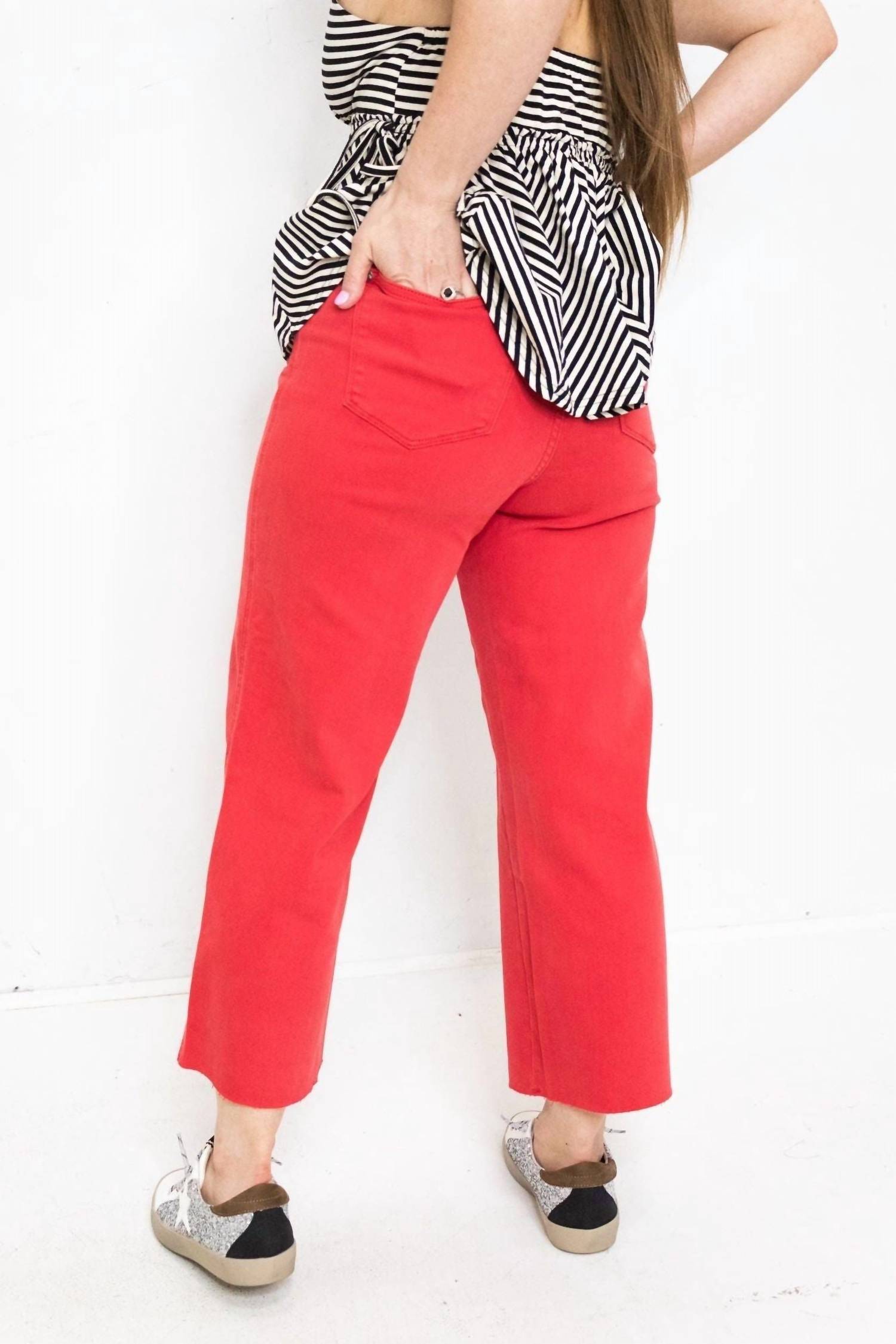 Introducing the Women's Red Wide Crop by Judy Blue, a stylish streetwear essential perfect for your summer wardrobe. Crafted from a high-rise, garment-dyed red denim, its composition is 93% Cotton, 6% Polyester, and 1% Spandex, providing effective tummy control and a flattering fit. Featuring a wide bootcut leg and a convenient zip closure, it's both comfortable and fashionable. Care for this piece with hand washing in cold water, laying it flat to dry, and ironing at a low temperature.