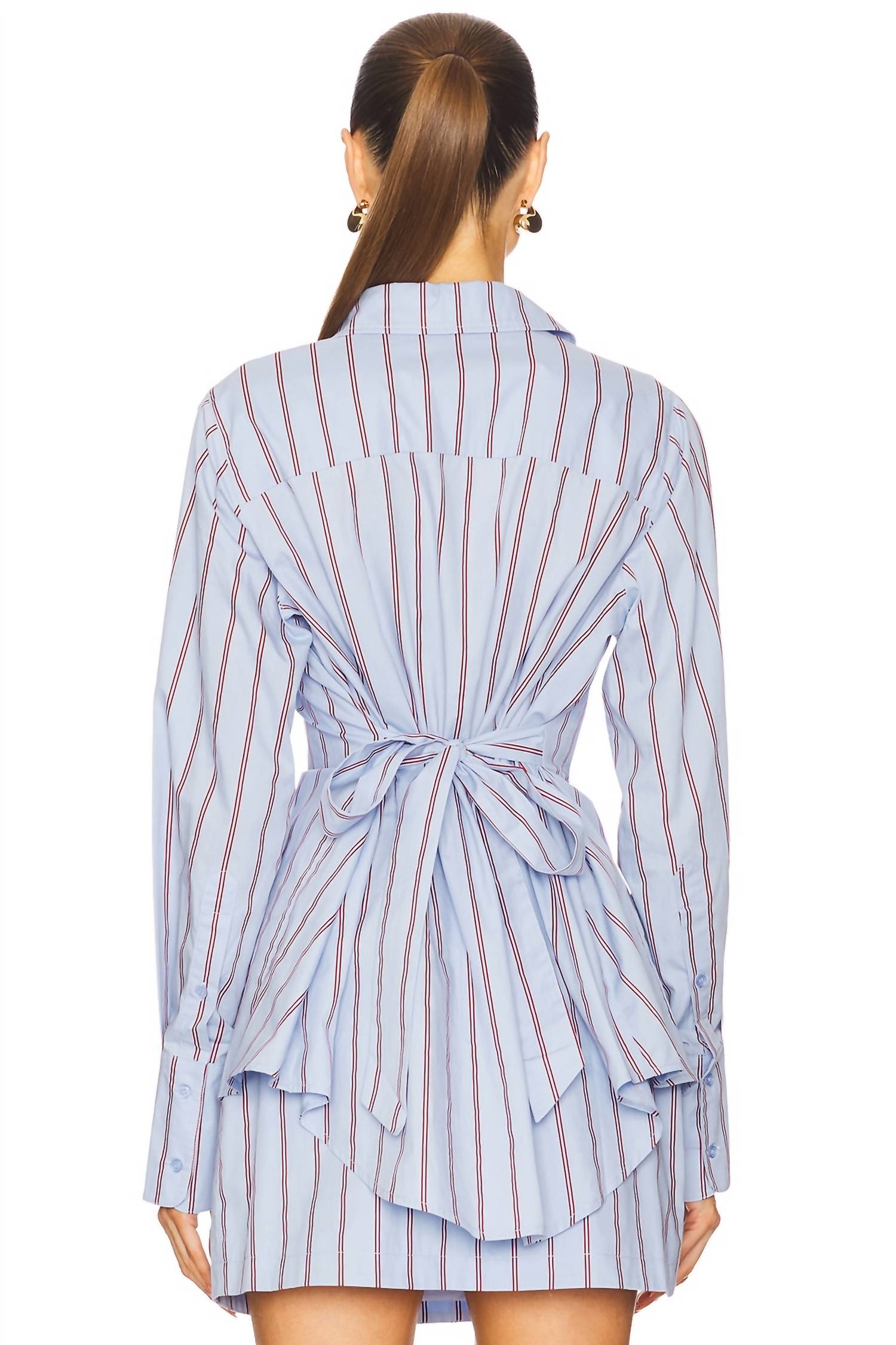 Introducing the Getty Long Sleeve Shirt by Line and Dot, a chic blue-button-down shirt that redefines sophistication. Designed with a classic collar and striped pattern, it features long sleeves and a convenient chest slip pocket for added practicality. Crafted from 100% cotton with a front button closure and a charming bow detail at the back, this shirt offers both comfort and style. Care: Dry clean only. Perfect for summer gatherings or a dinner party, especially during Thanksgiving.