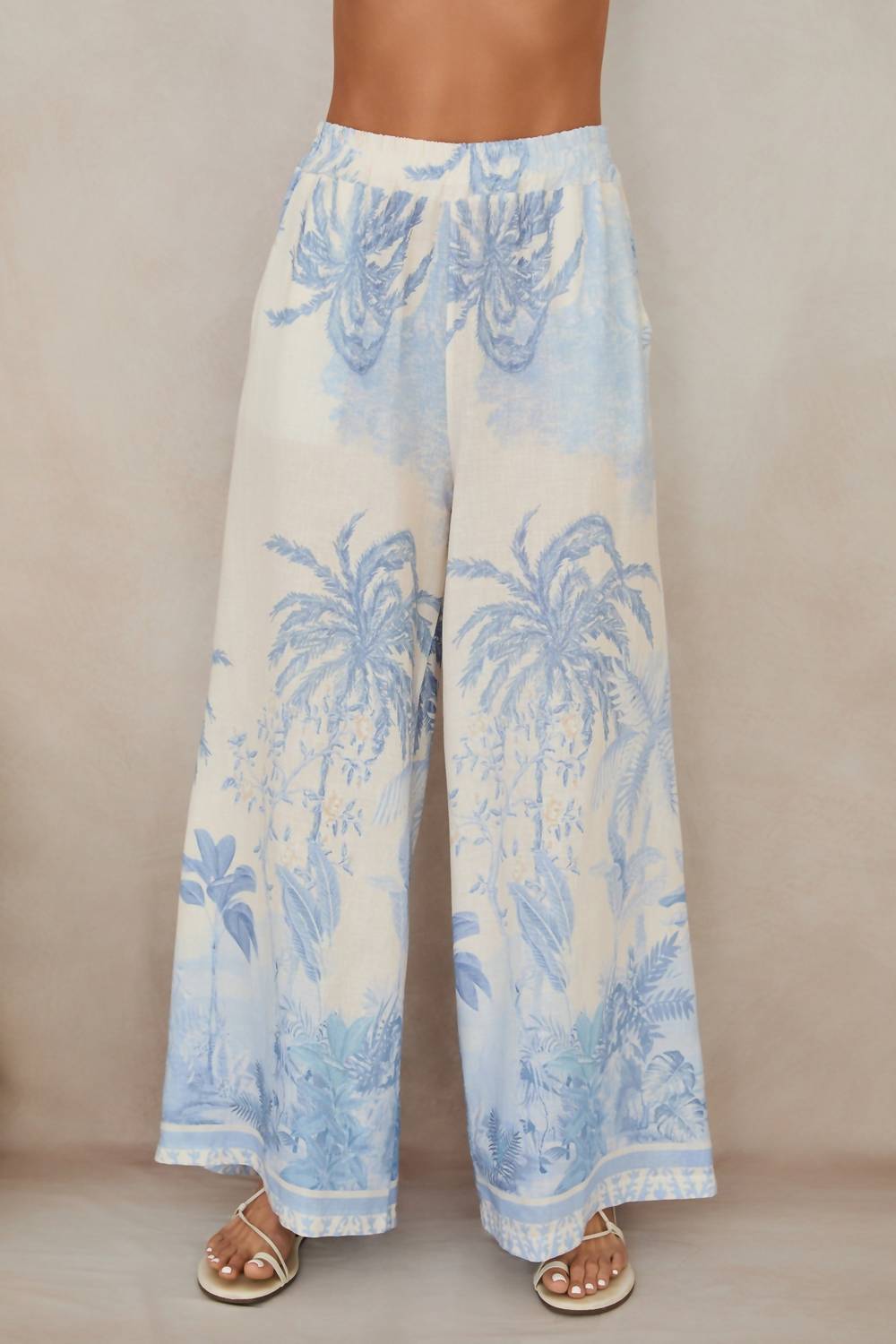 Discover the Tropical Palm Tree Wide Leg Linen Pants by Milio Milano, a perfect blend of comfort and style. With a relaxed fit and chic wide leg, these cream and blue pants exude a tropical vibe ideal for summer outings. Crafted from 70% viscose and 30% linen, they feature a pull-on closure and pockets for added convenience. Care for them with a gentle machine wash in cold water with like colors, and line dry to maintain their freshness.
