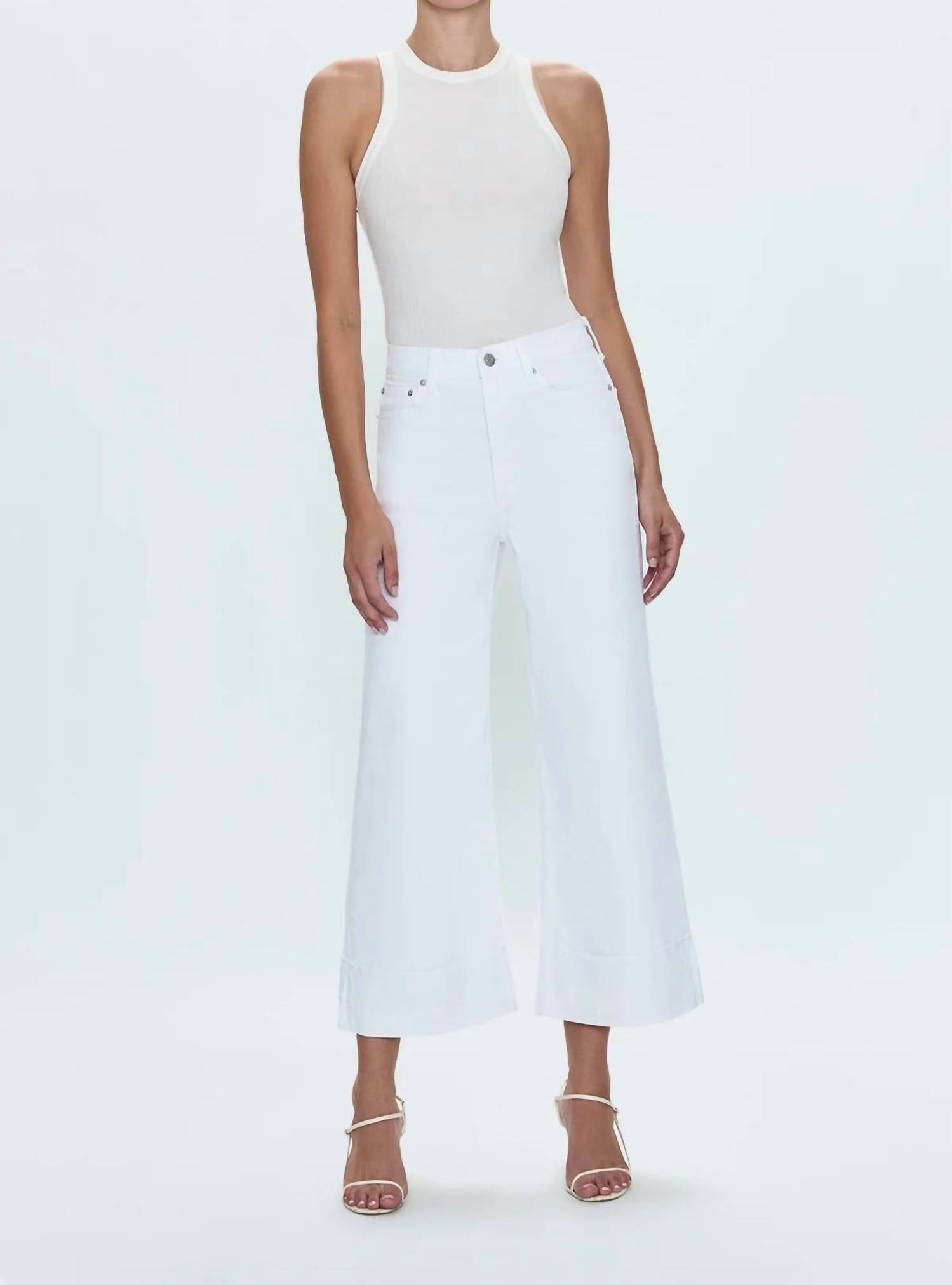 Presenting the High-rise Wide Leg Crop Jeans by Pistola, a chic addition to any fashion-forward wardrobe. Crafted from signature comfort stretch denim, these jeans offer a relaxed fit with a structured shape and intriguing ultra wide leg silhouette. Featuring a vivid white wash with metal hardware details, they come with functional pockets and a stylish raw finished hem with wide, folded cuffs. Closure is secured with a zip, and care is effortless with a machine wash and tumble dry.