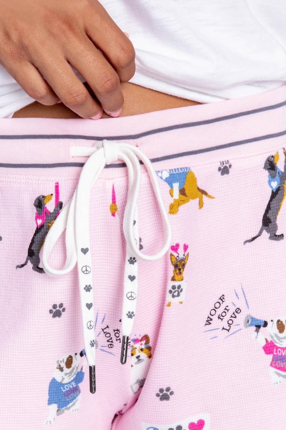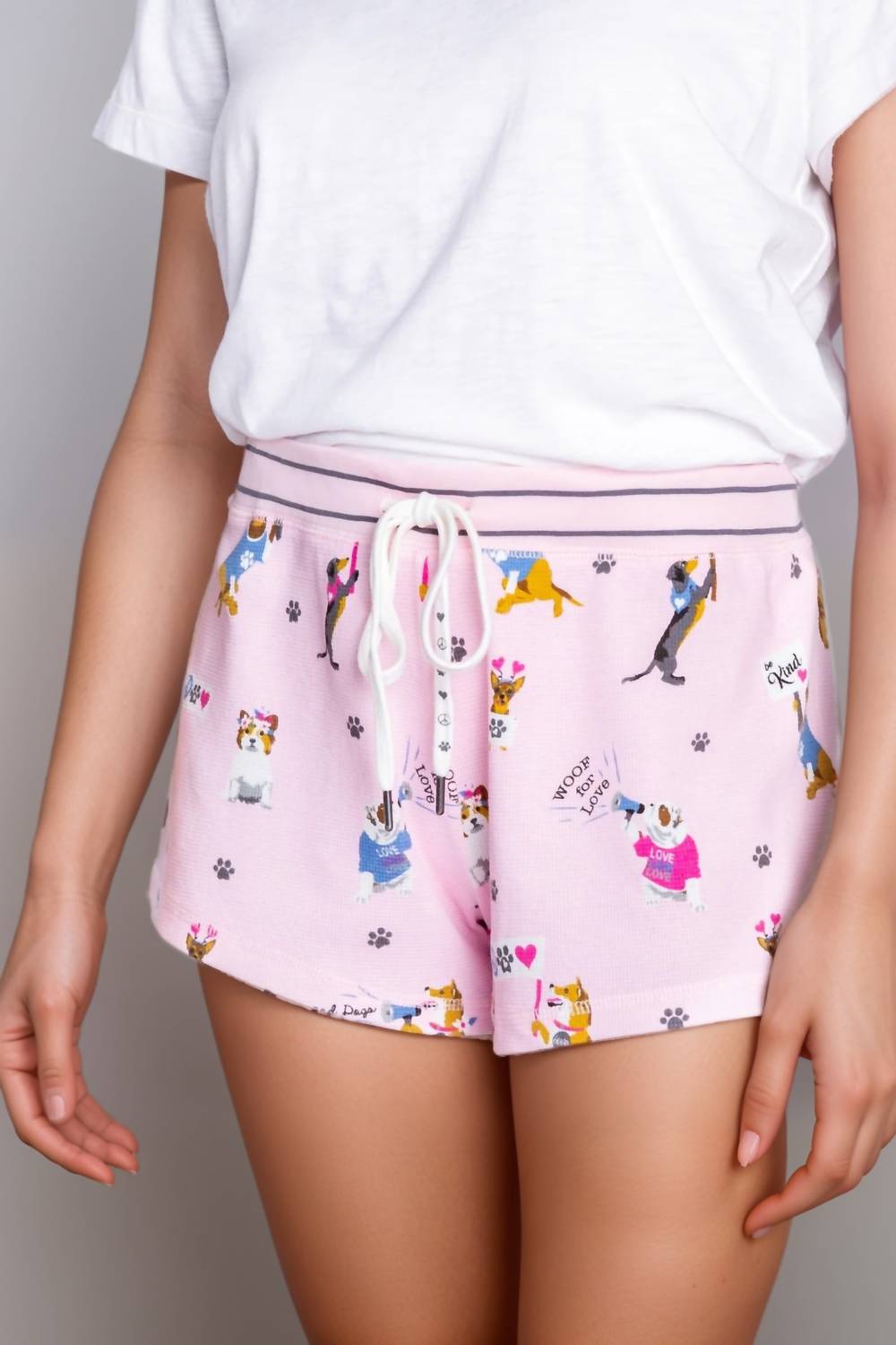 Tuck your favorite tee into these high-waist shorts for a more casual-cool feel. Discover cozy comfort with the PJ Salvage Woof For Love Short in a charming Blush Woof color. These lounge shorts feature a playful graphic print of dogs and are crafted from a soft and comfy blend of 52% Cotton, 41% Rayon, and 7% Elastane Thermal fabric. Designed for women, these high-waist shorts offer a pull-on style with a striped elastic waistband and drawstring for the perfect fit. Enjoy laid-back summer days in style with this delightful piece, which pairs perfectly with the PJ Salvage REWLLS top.