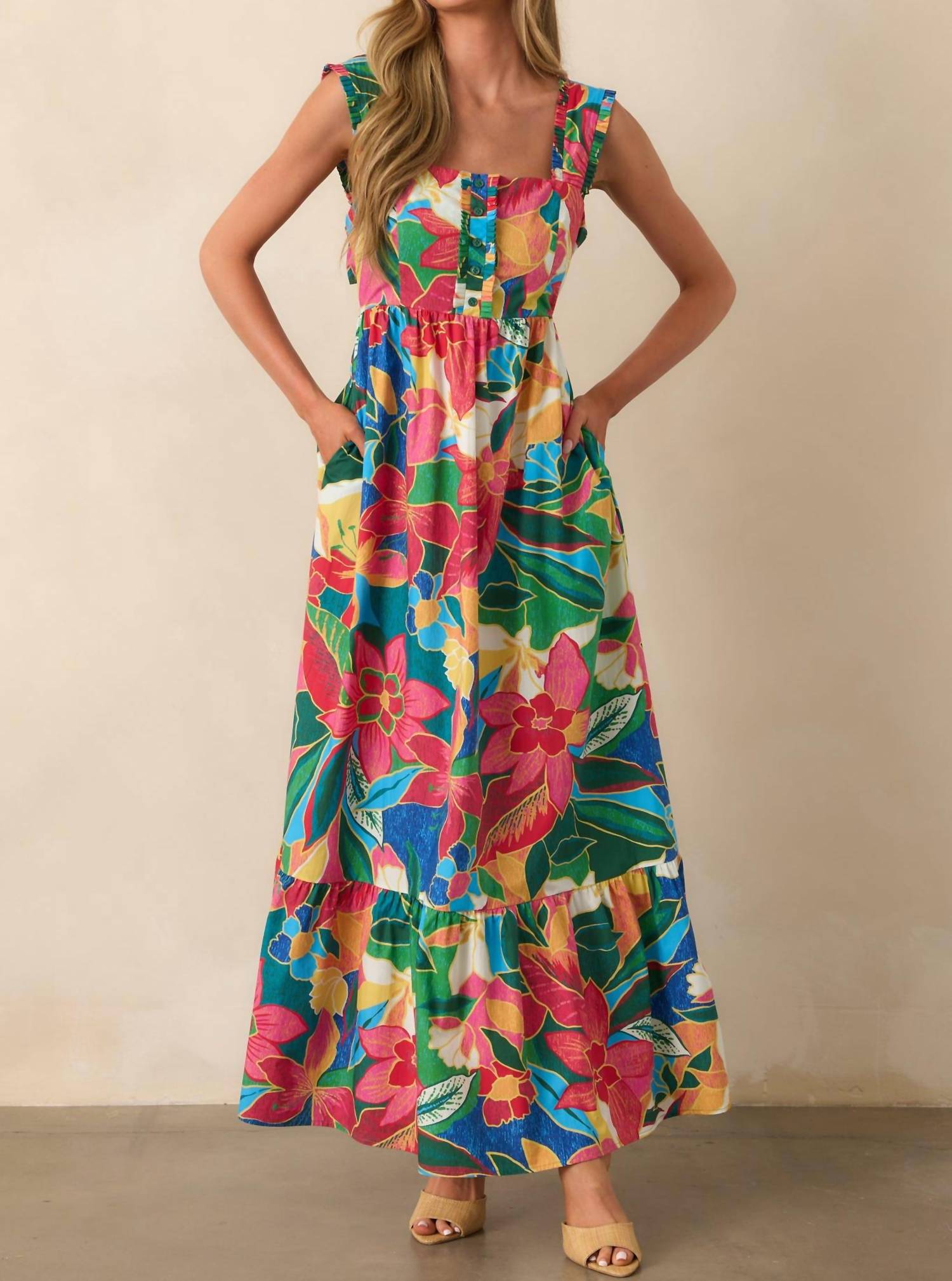 Style this maxi with your favorite statement necklace and sandals for the perfect look. Enhance your summer wardrobe with the Tropical Print Tiered Maxi Dress by SKIES ARE BLUE, a striking piece designed for women who love bold style. This sleeveless, A-line silhouette dress boasts a vibrant red, patterned print perfect for a maximalist vacation look. Crafted from 100% breathable cotton, this pull-on dress includes the practicality of pockets and features a flattering squareneck. Care for your garment by hand washing and line drying to maintain its stunning appearance.