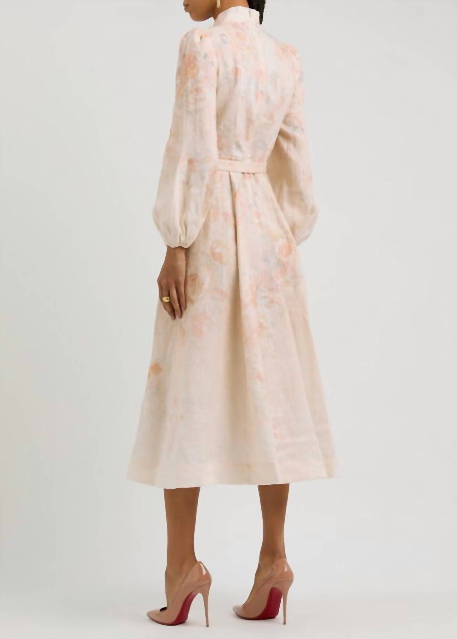 A midi dress so versatile, your options for wearing it are endless. Elevate your spring wardrobe with the Zimmermann Crush Buttoned Midi Dress in an enchanting Ciara Floral print. This A-line silhouette boasts long sleeves and a chic collar neckline, crafted from 100% linen for breathable comfort. It features a button closure for easy wear. Care instructions recommend dry cleaning to maintain its maximalist charm, ideal for wedding occasions.