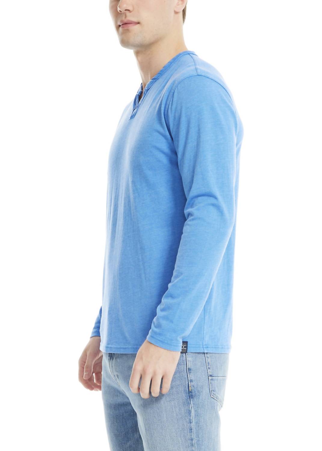 T-shirt with a two-button placket on the front. Long sleeves and a rounded hem. Regular fit. 29" length measured using size M. Machine wash. 50% Cotton, 50% Polyester.