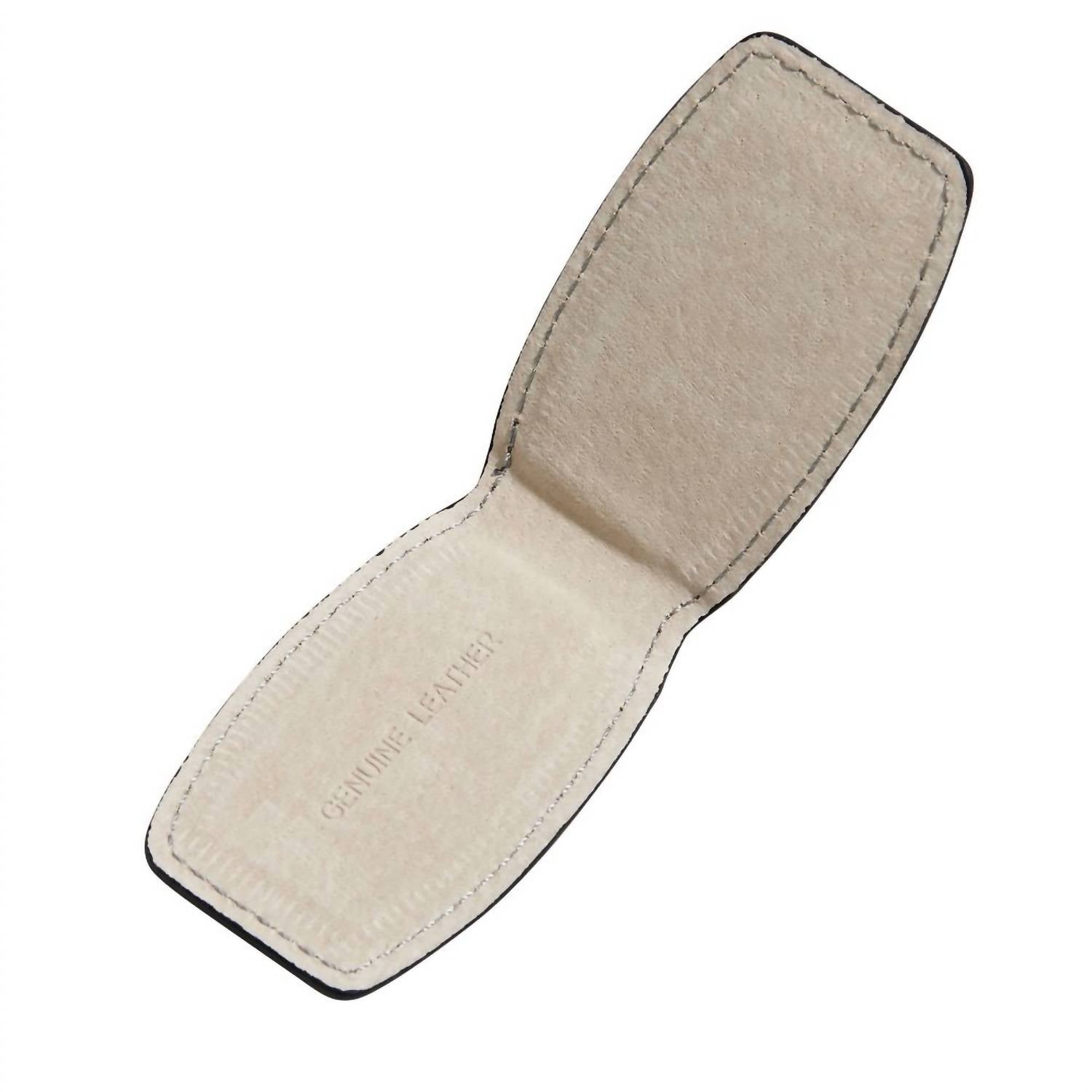 Genuine leather money clip has magnets embedded in each side beneath the rich, brown leather, which allows this money clip to securely hold your money. Detailed stitching runs around the edge of the clip. 2.75" L x 1.5" W when closed. Gift Boxed.