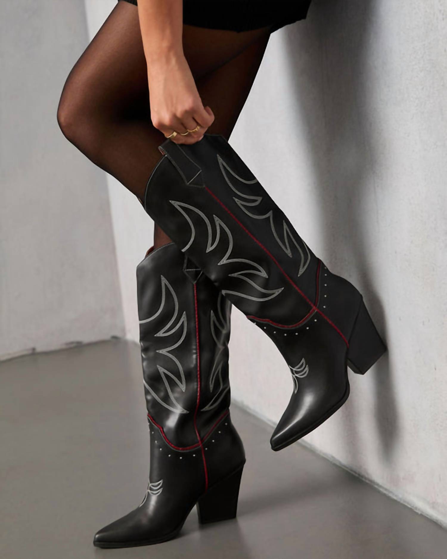 Experience the perfect blend of classic style and modern edge with the Ashton Western Boot by OASIS SOCIETY. Crafted from premium leather, these black cowboy boots feature a pointed toe and intricate white and red stitched details. The high 3.2-inch block heel offers both comfort and an added touch of height, perfect for pairing with jeans or dresses. Designed for women, these medium-width boots are a versatile choice for those seeking to add a bold statement to their wardrobe.