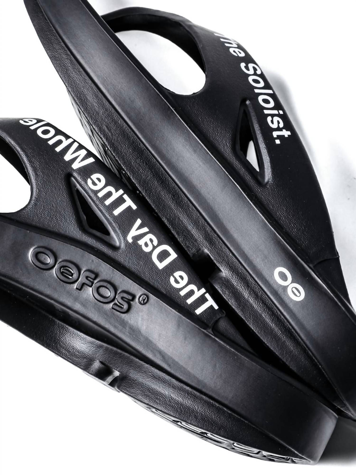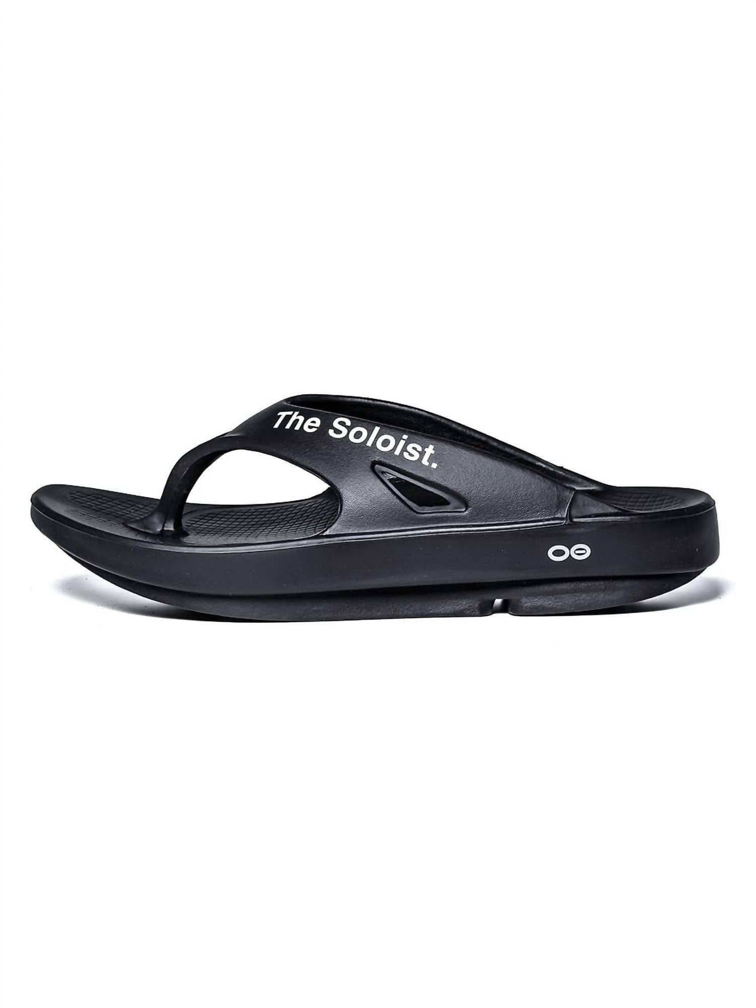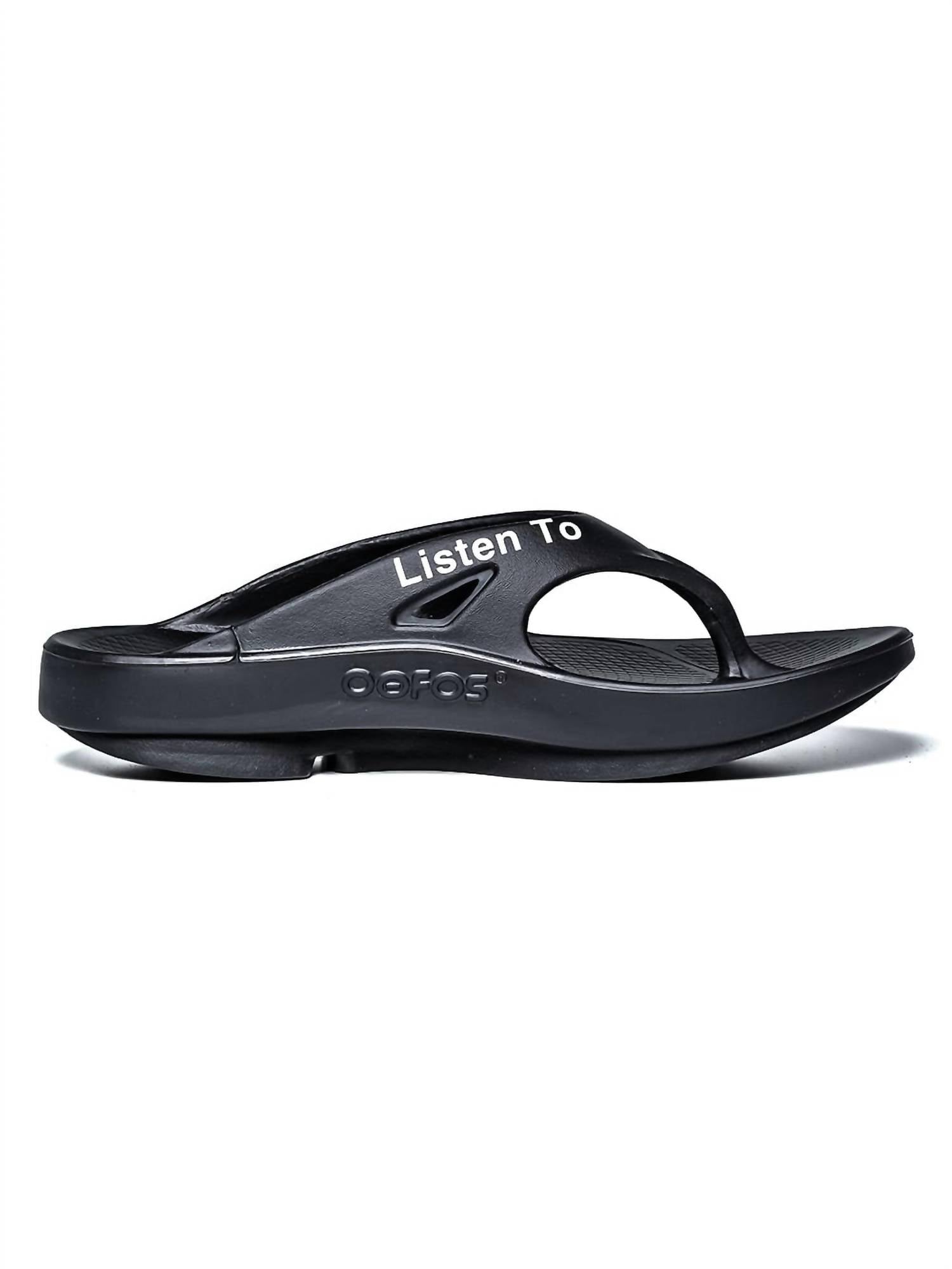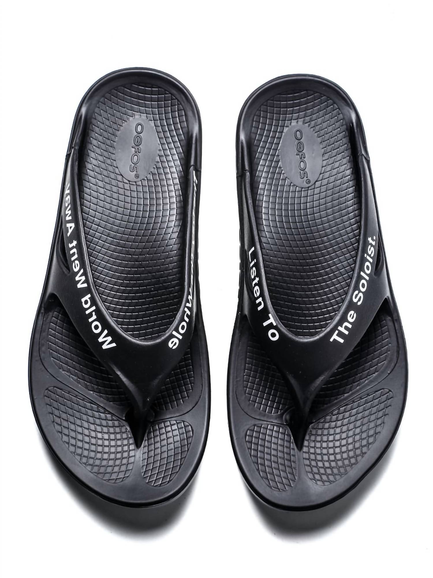 Introducing the Men's Flip Flop by OOFOS x TAKAHIROMIYASHITATheSoloist., a stylish choice in classic black for your summer adventures. Crafted from 100% recovery foam rubber, these sandals are designed for exceptional comfort and support. Featuring unique inscriptions "LISTEN TO THE SOLOIST" and "THE DAY THE WHOLE WORLD WENT AWAY," the flip flops add a touch of personality to your travel attire. Made in Vietnam with a round toe shape.
