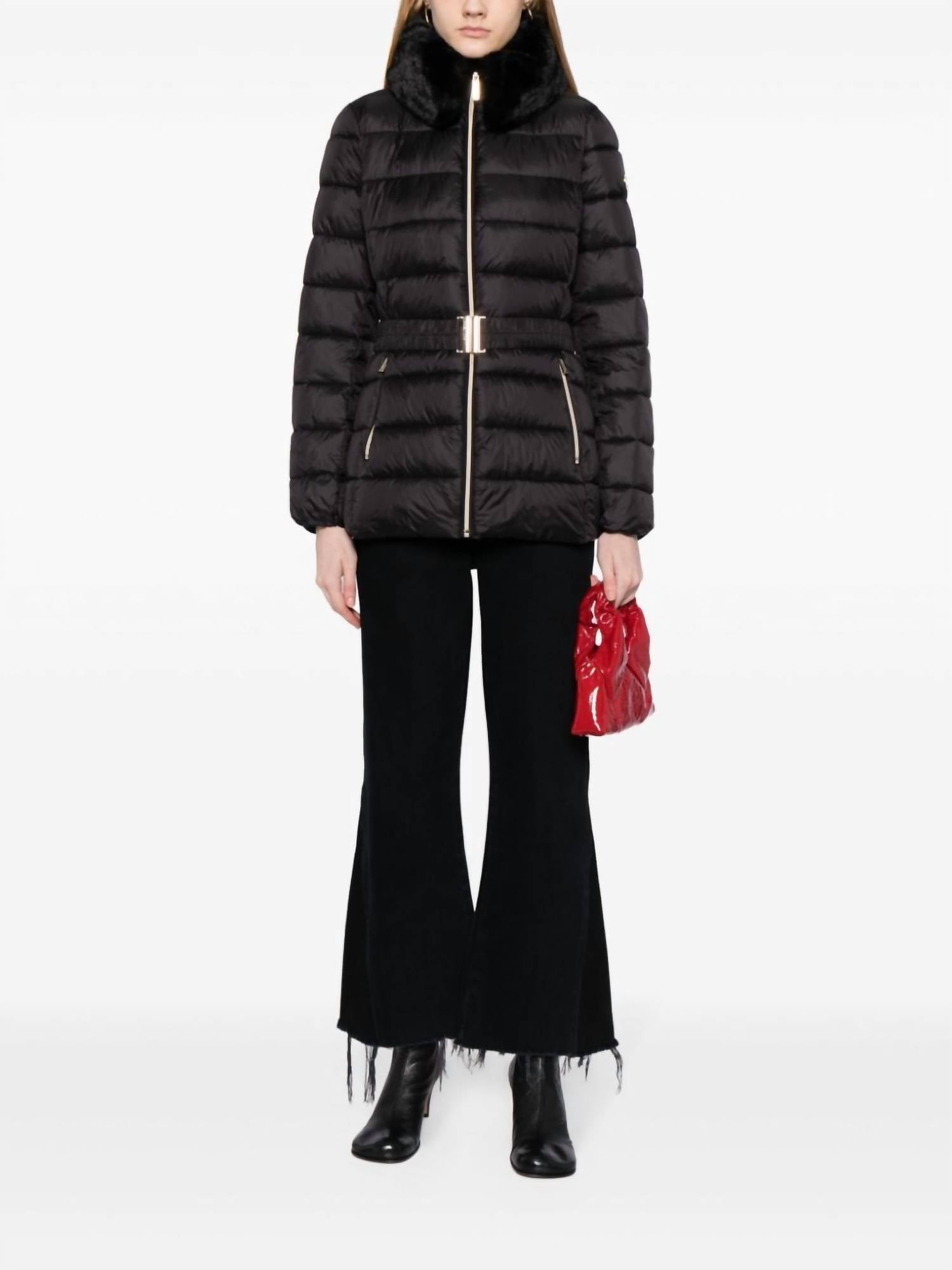 Cozy, cute and timeless. The puffer jacket that will keep you warm all season long.Removable faux-fur stand collar; front zipper closure. Nylon Polyester Blend. Very Lightweight but Warm - Down Fill. Belted. Gold Hardware. Machine Wash Gentle. Long sleeves. Elasticated cuffs. Straight Hem.