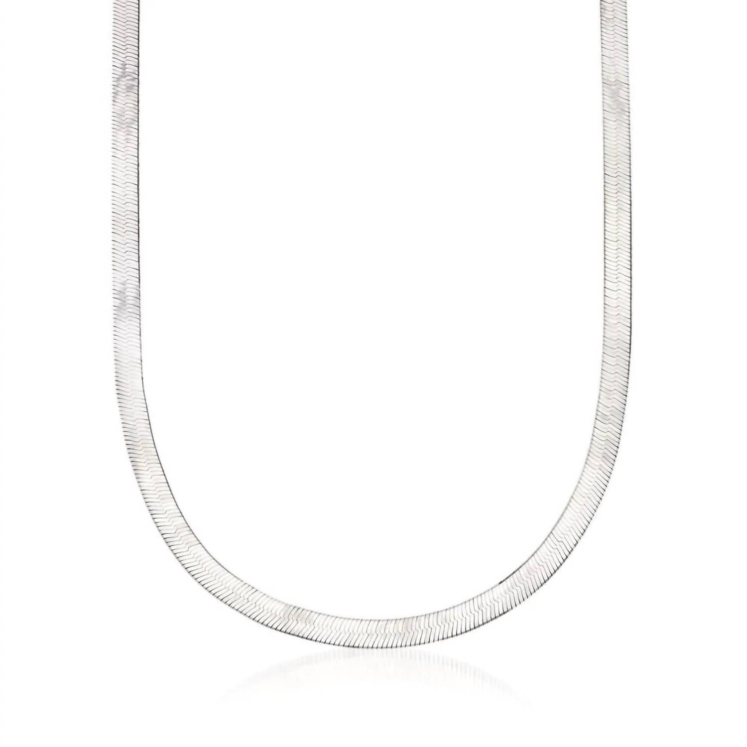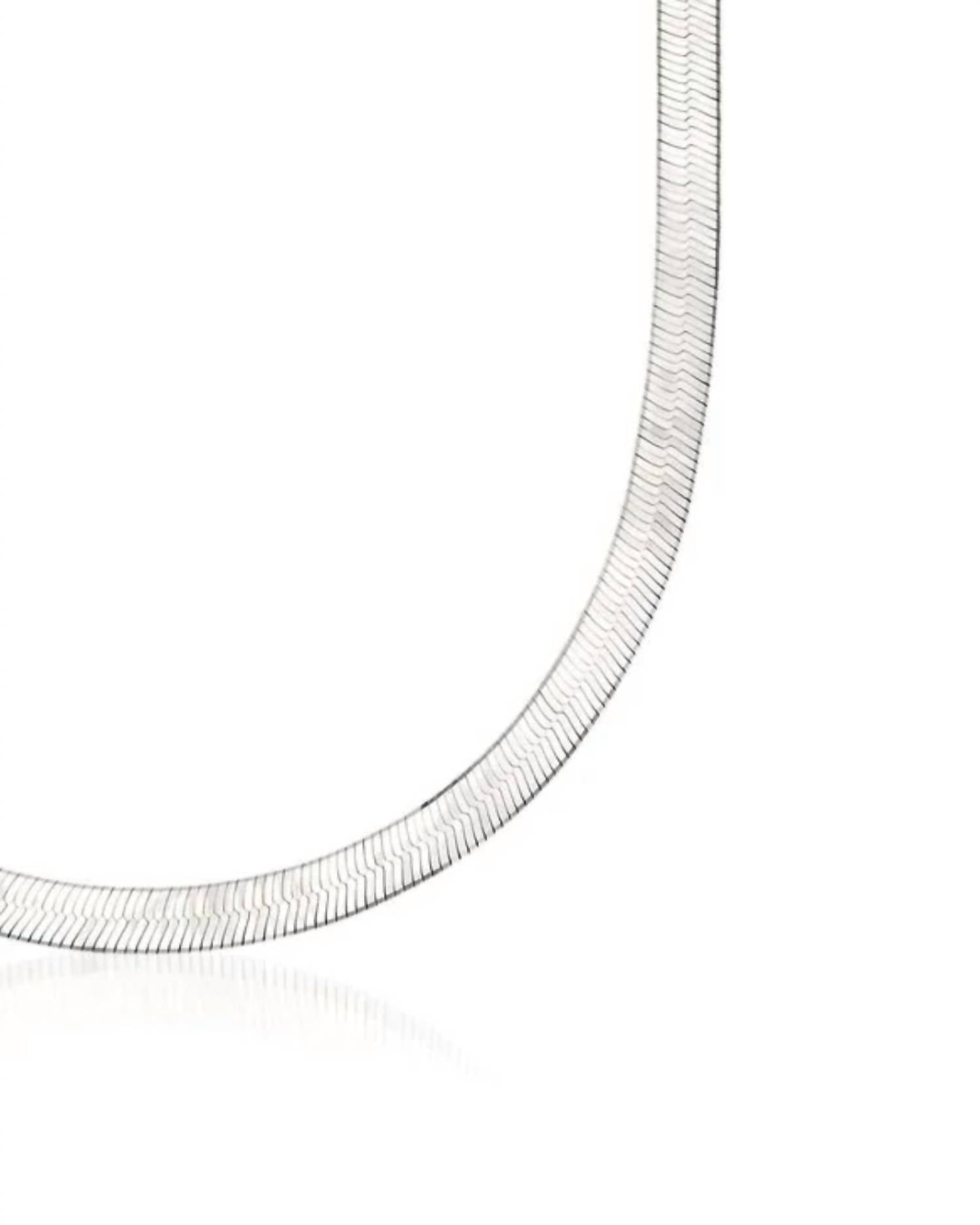 Layer this necklace or wear it on its own. Either way it's a win-win. Introducing the Women's Python 4mm Necklace by Electric Picks, a sleek addition to any jewelry collection. With a length of 16 inches, this herringbone chain is expertly crafted in 18kt gold and sterling silver filling, offering a gleaming finish perfect for layering. The 4mm thickness adds a touch of bold elegance. This stylish piece is a testament to high-quality design with its versatile silver tone.