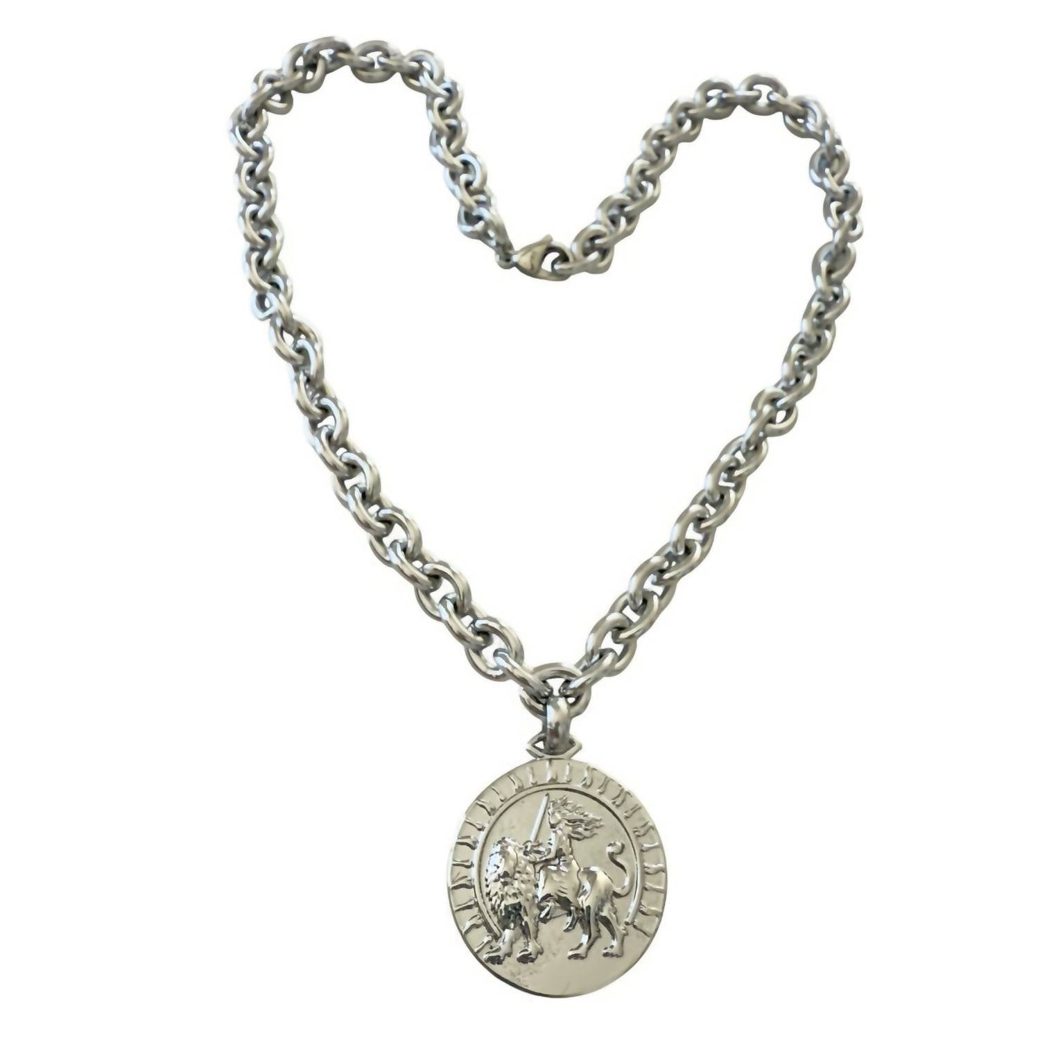Unleash the fearless spirit within with the Women's Lion Tamer Amulet Necklace by Jagged Halo Jewelry. This daring piece features a gold-filled pendant, the size of a US quarter coin, set on a 23-inch long stainless steel chain and hardware. Closure: Lobster claw clasp. Care: Wear it anywhere, from the shower to the pool, as it's sweat-proof and water-ready.