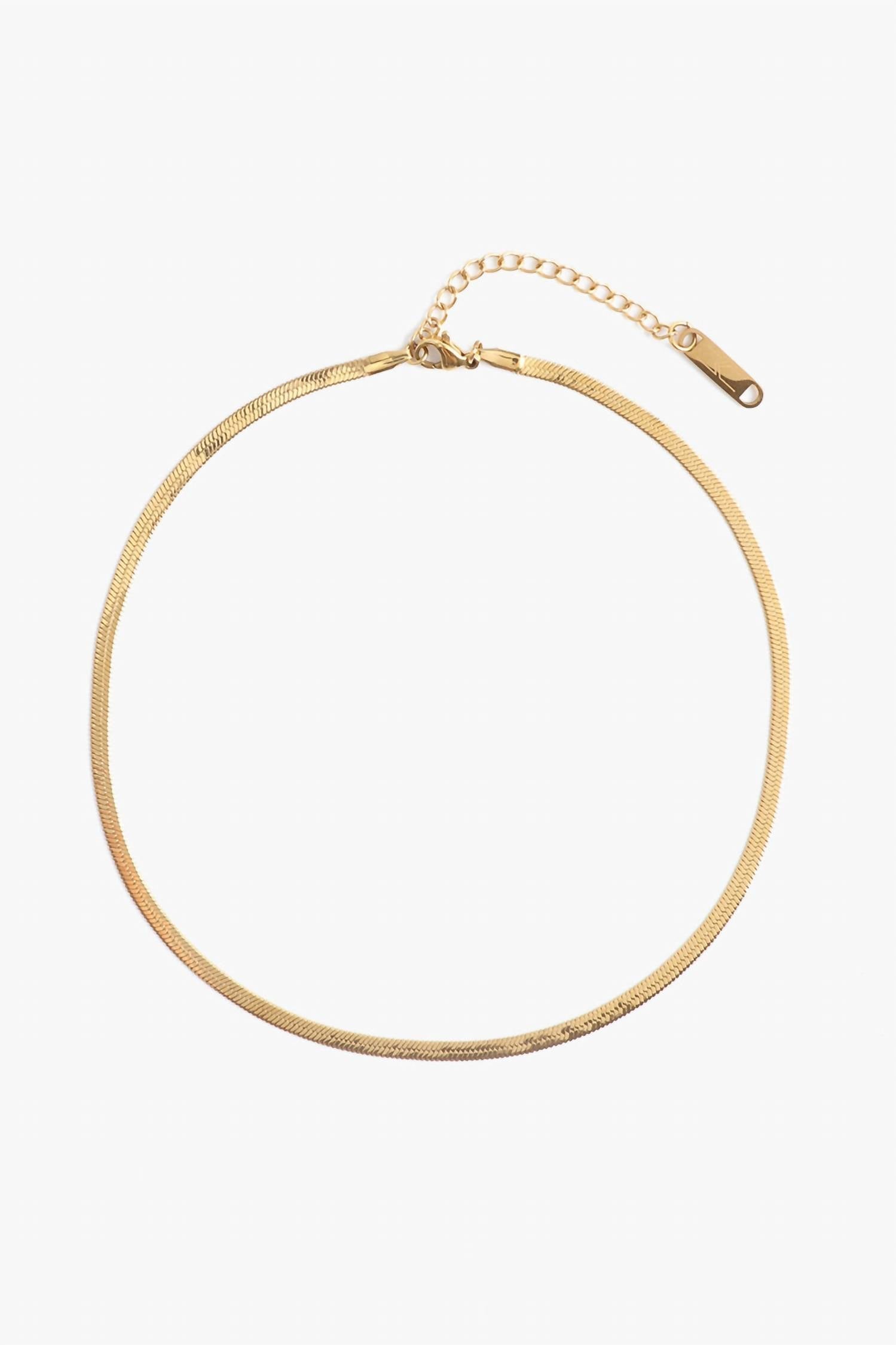 Layer this necklace or wear it on its own. Either way it's a win-win. Introducing the Women's Ramsey Choker Necklace by Marrin Costello, a chic addition to any jewelry collection. Sleekly designed with plated stainless steel, this necklace gleams with a shimmering herringbone pattern. At 13 inches in length and 3mm wide, it includes a 2-inch extender for flexibility. Featuring a lobster clasp closure, it's hypoallergenic, non-tarnish, and water-resistant.