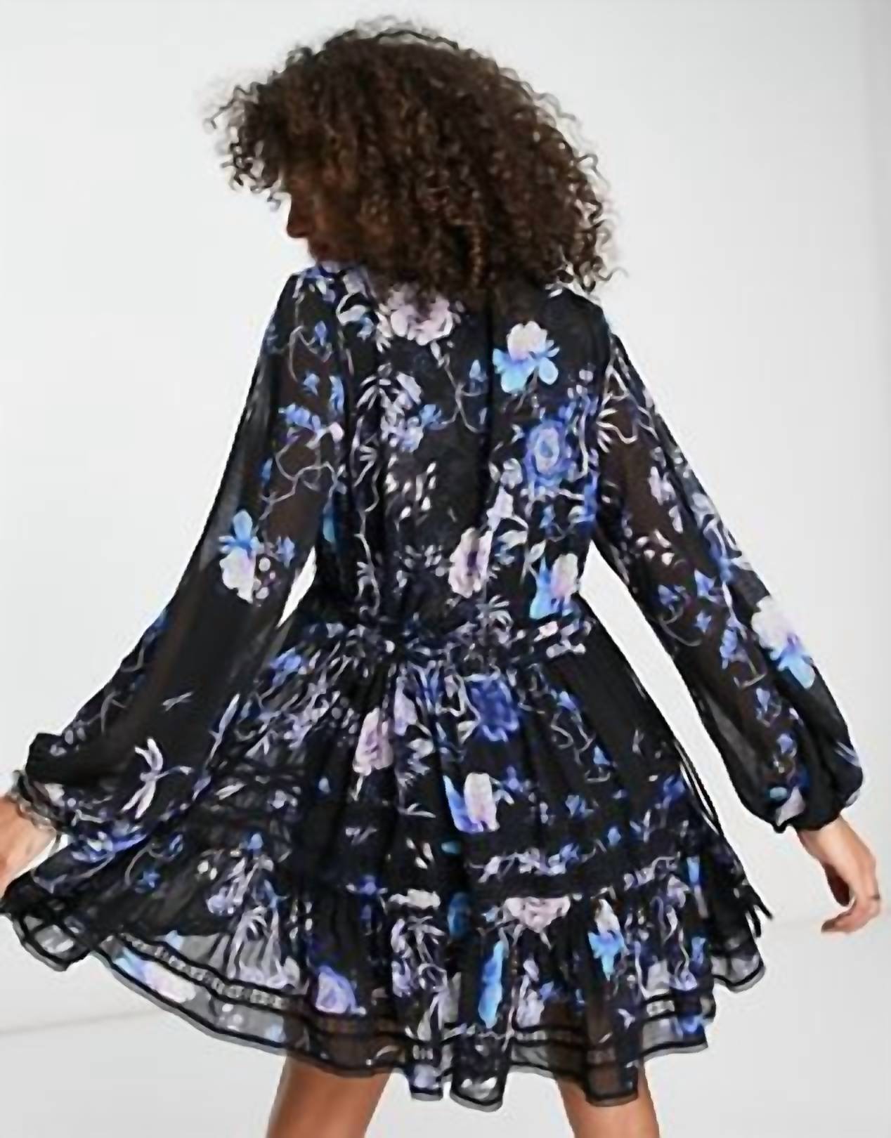 Timeless feminine. Flowy floral print short dress. Deep V-neck. Lace trim. Drawstring waist. Machine washable in cold water. 100% Polyester.