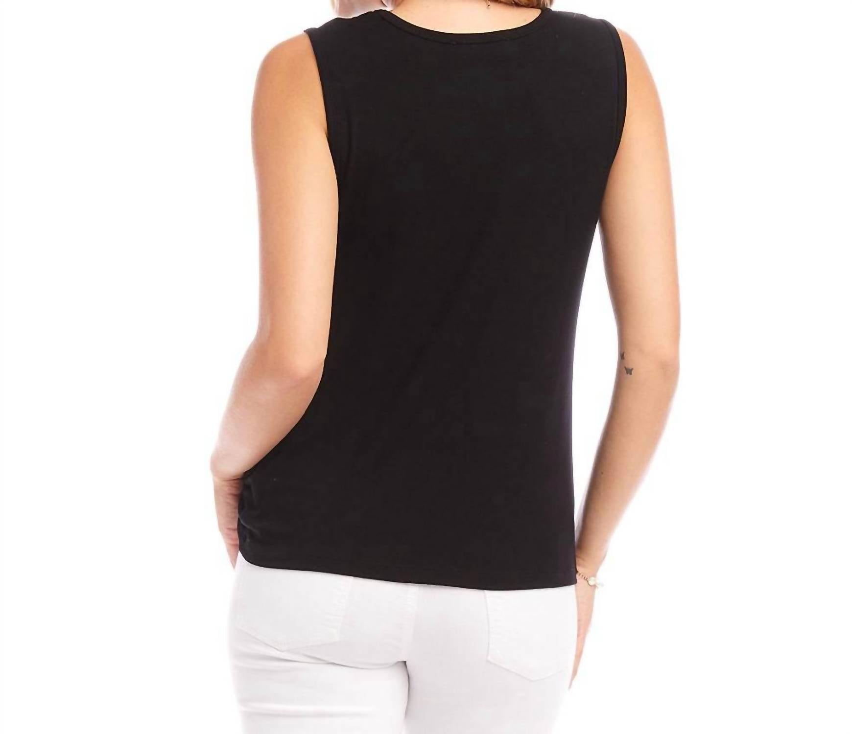 Elevate your wardrobe with the Sleeveless Pick-Up Top by Karen Kane, a chic addition ideal for warmer days or stylish layering. Crafted from a luxurious blend of 92% Rayon and 8% Spandex jersey, this black blouse offers both softness and stretch for unparalleled comfort. Made in the USA, it features a trendy side pick-up detail and a crew neckline for a flattering silhouette. Closure is easy with a pull-on style, while care requires dry cleaning or hand washing in cold water, then laying flat to dry. Length is approximately 20 5/8 inches for size M.