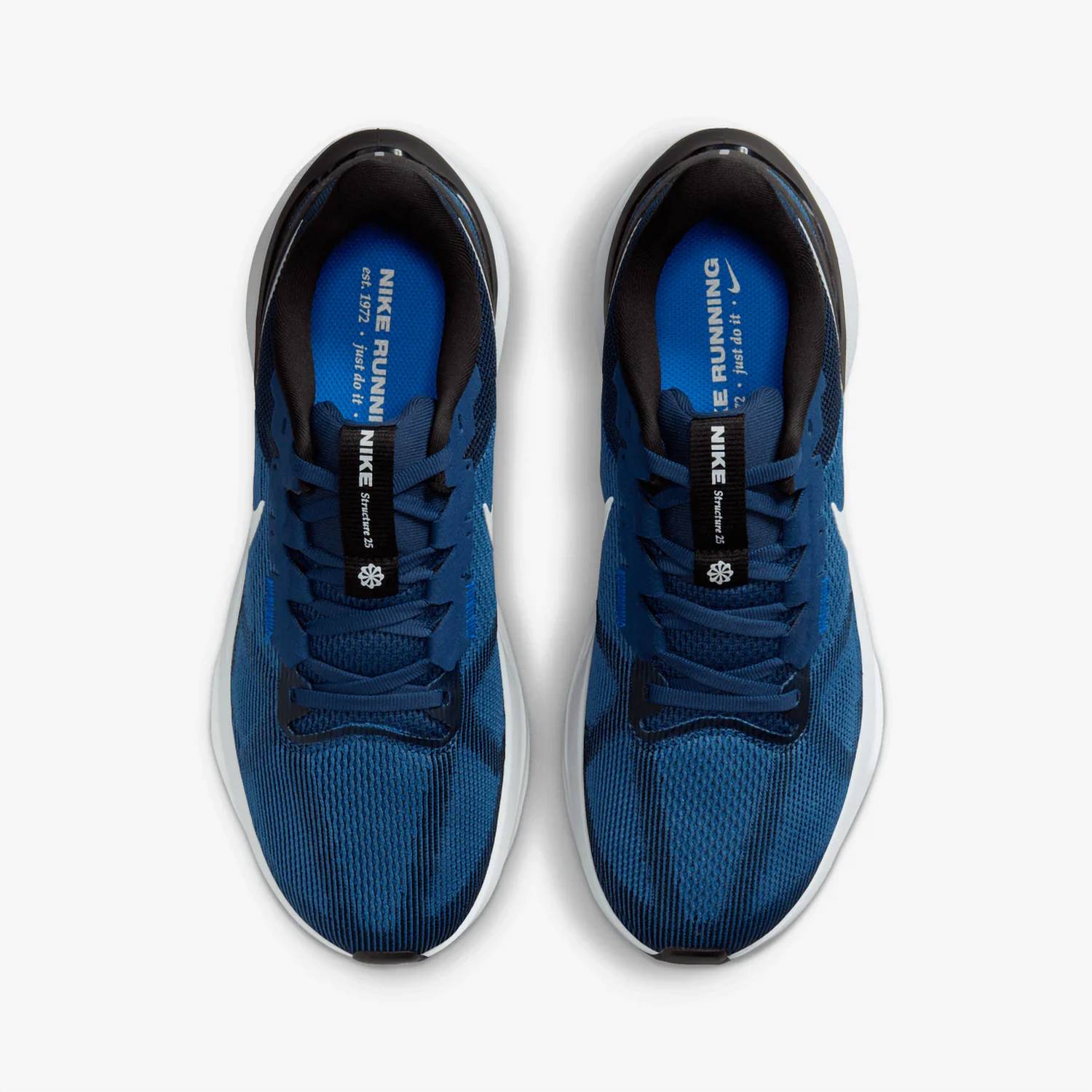 Step into comfort with the Men's Structure 25 Road Running Shoes by NIKE, designed for a supportive ride on your runs. Featuring a breathable mesh upper with targeted support zones, these shoes are ideal for fitness and workout sessions. The Cushlon 3.0 foam midsole combined with an Air Zoom unit ensures cushioning and stability, while the durable Waffle outsole provides reliable traction. With a weight of approximately 289g in men's UK 9 and a 10mm heel-to-toe drop, these shoes offer a stable, consistent fit and reflective design details for enhanced visibility.