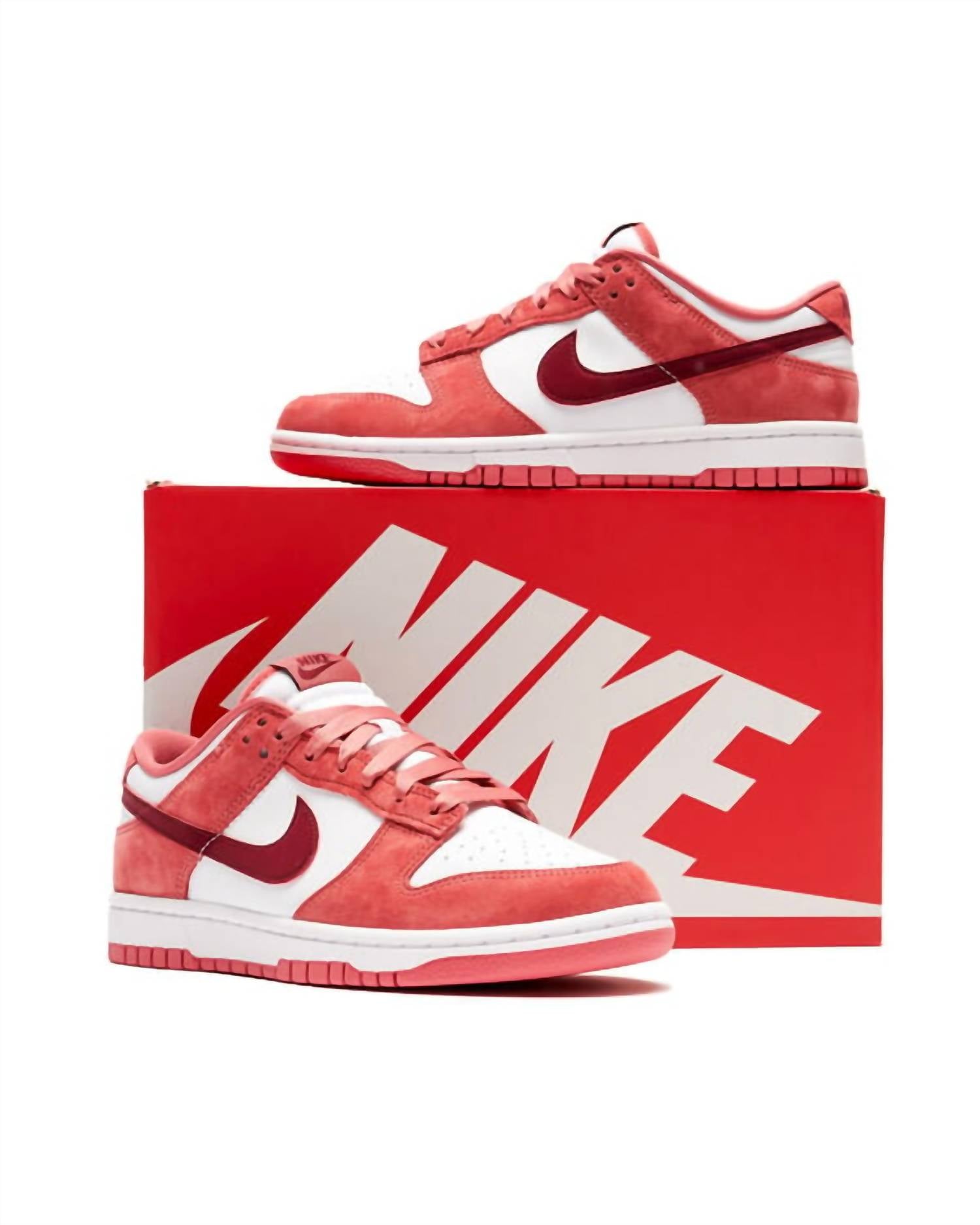 Cute, functional, and comfortable. These sneakers check all the boxes. Meet the Women's Dunk Low Sneakers by NIKE, a stylish resurgence of an '80s basketball icon now perfect for streetwear enthusiasts. Crafted with a soft, durable upper that develops character over time, these sneakers feature a low-cut collar for both style and comfort. The foam midsole provides lightweight, responsive cushioning, while the rubber outsole enhances durability and traction. Presented in a striking White/Team Red-Adobe-Dragon Red colorway, these sneakers are ideal for game day and beyond.