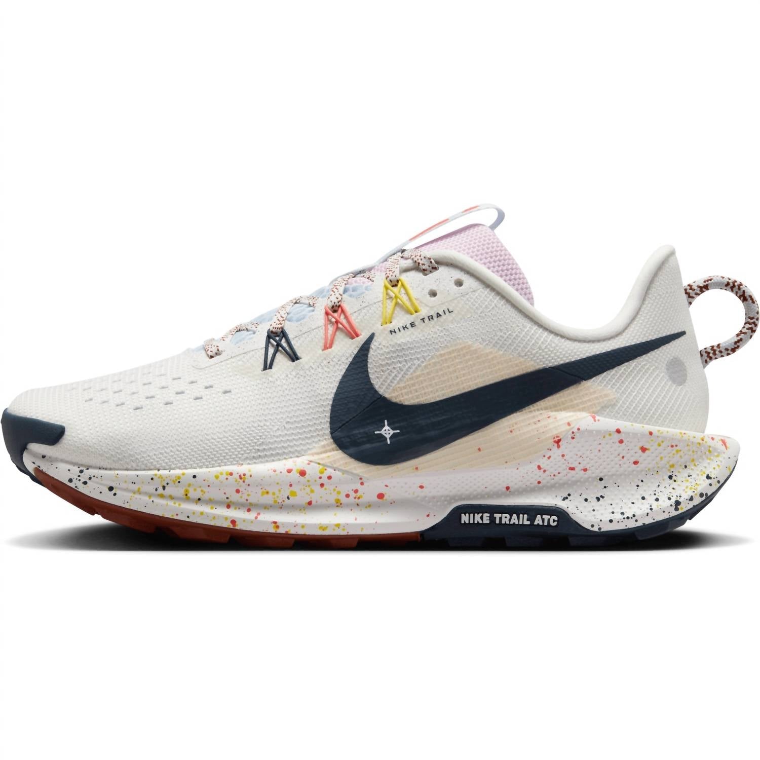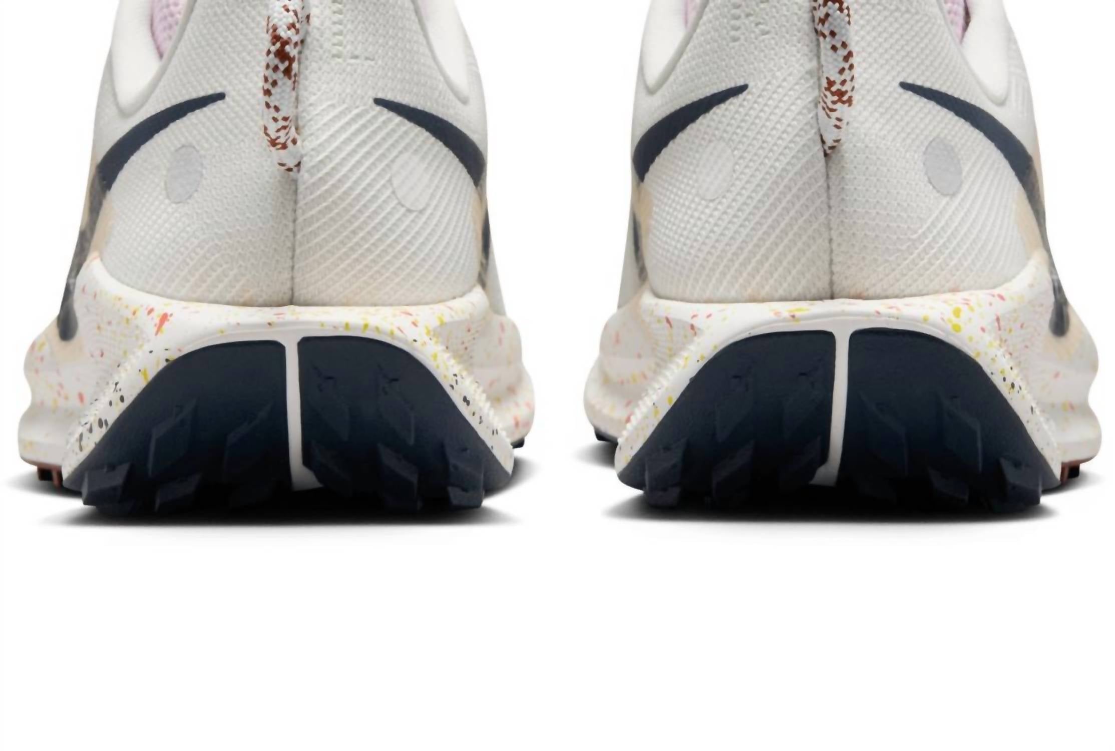 Workout in style with these adorable athletic sneakers. Experience the ultimate in performance with the Women's Pegasus Trail 5 Shoes by NIKE in stunning Summit White. Designed with a round toe and flat heel, these shoes feature Flywire technology integrated into a midfoot strap, ensuring optimal support. The ReactX foam midsole provides superior cushioning for a smooth ride on trails and roads, while the outsole rubber wraps around the forefoot for improved durability. Ideal for fitness workouts, these athletic shoes deliver enhanced breathability with a mesh upper, making them perfect for summer adventures.