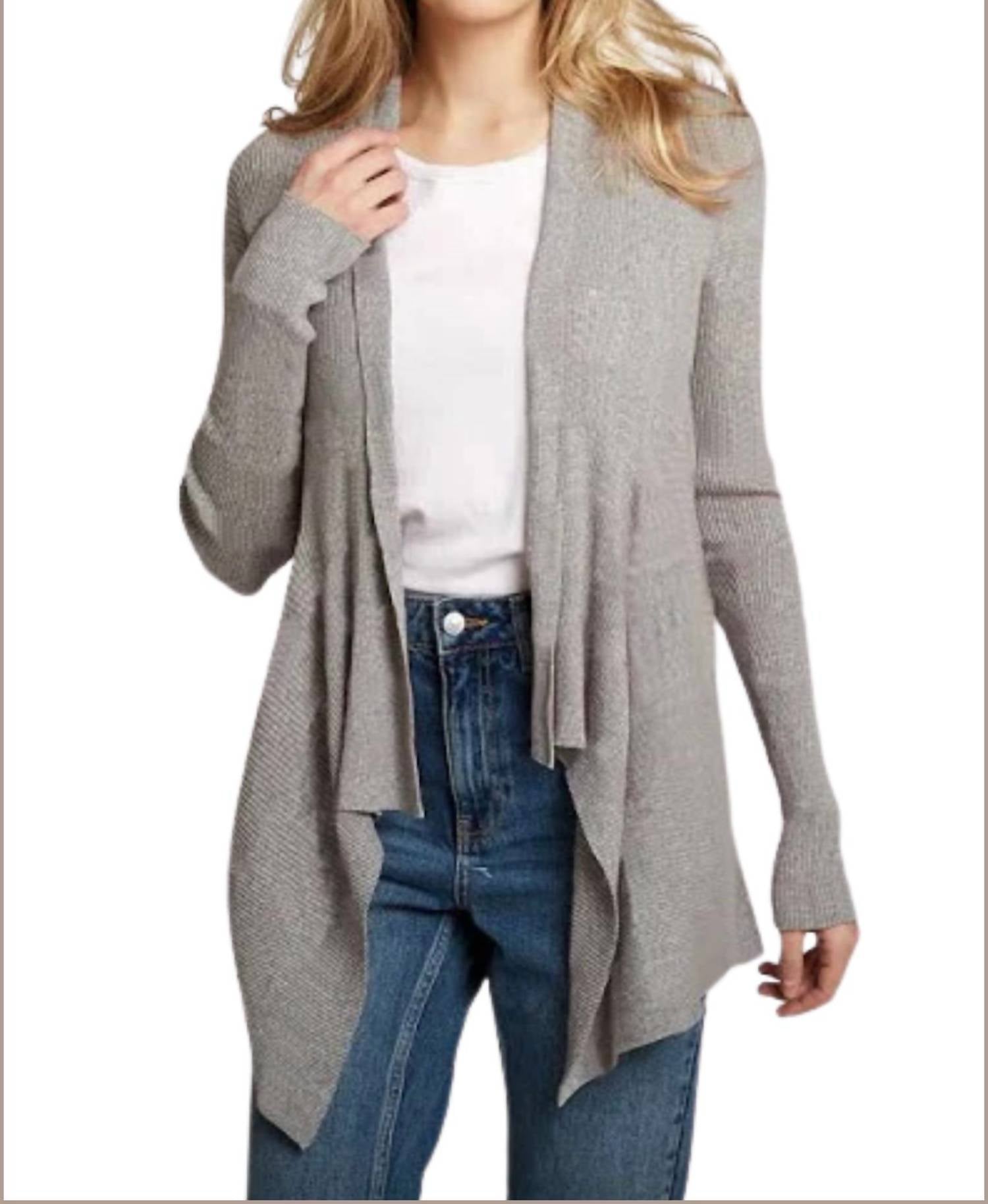 Throw this adorable cardigan over any cami or tank top. Introducing the Cotton Rib Drape Cardigan by Autumn Cashmere, a refined piece that combines comfort and elegance. Designed with long sleeves and an open front, it features a drape hem in a textured, ribbed fabric that flatters with its slightly loose fit. Crafted from 100% Italian cotton, this cardigan embodies luxury with yarn imported from Northern Italy. Proudly pull-on styled with a minimalist vibe, it requires dry cleaning to maintain its soft, sweat-gray hue, perfect for travel and casual elegance.