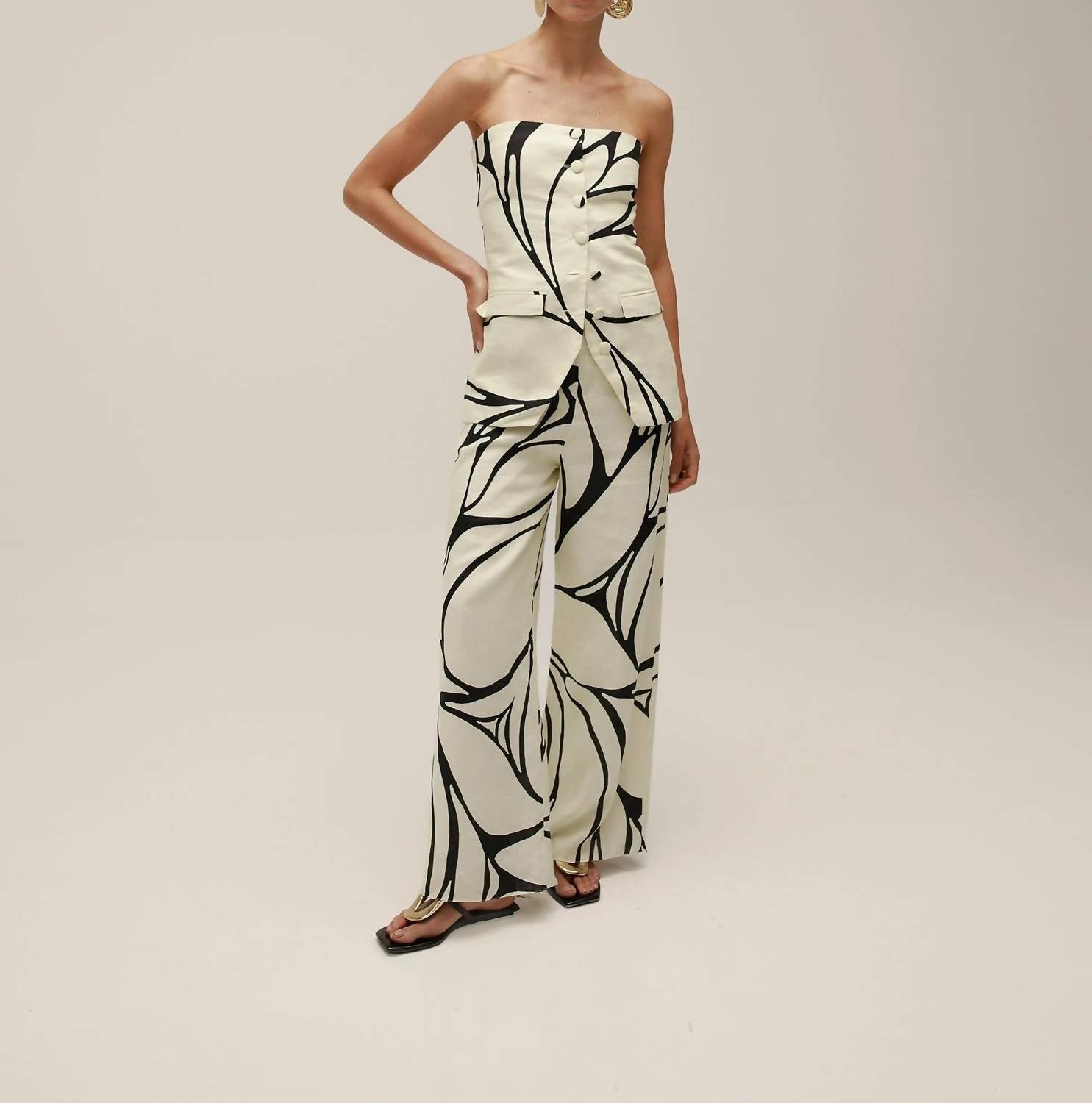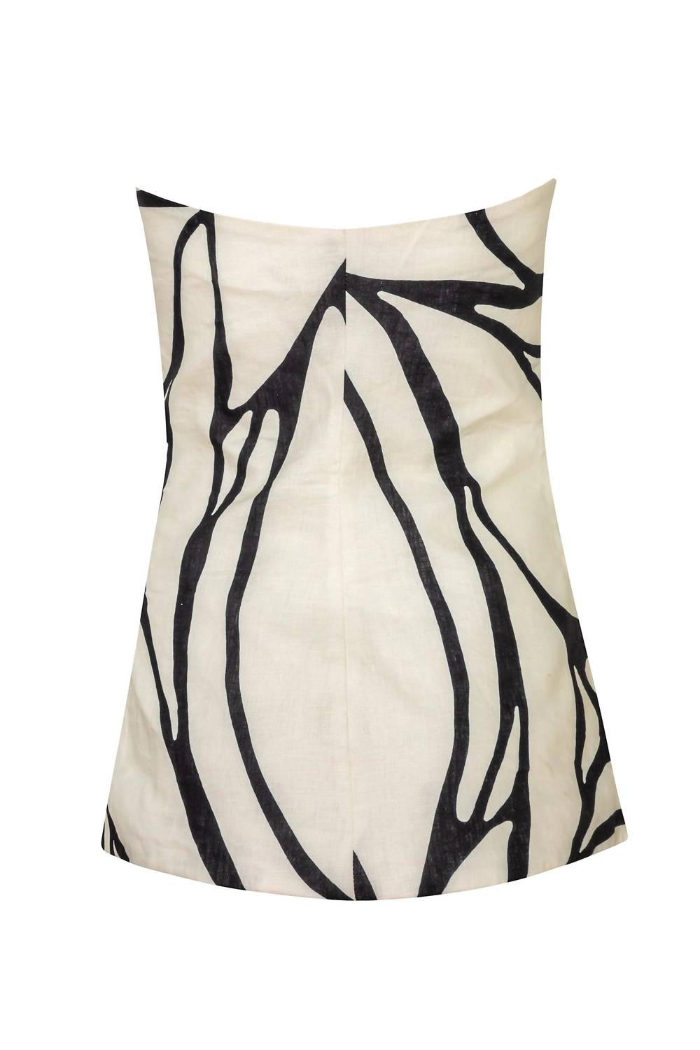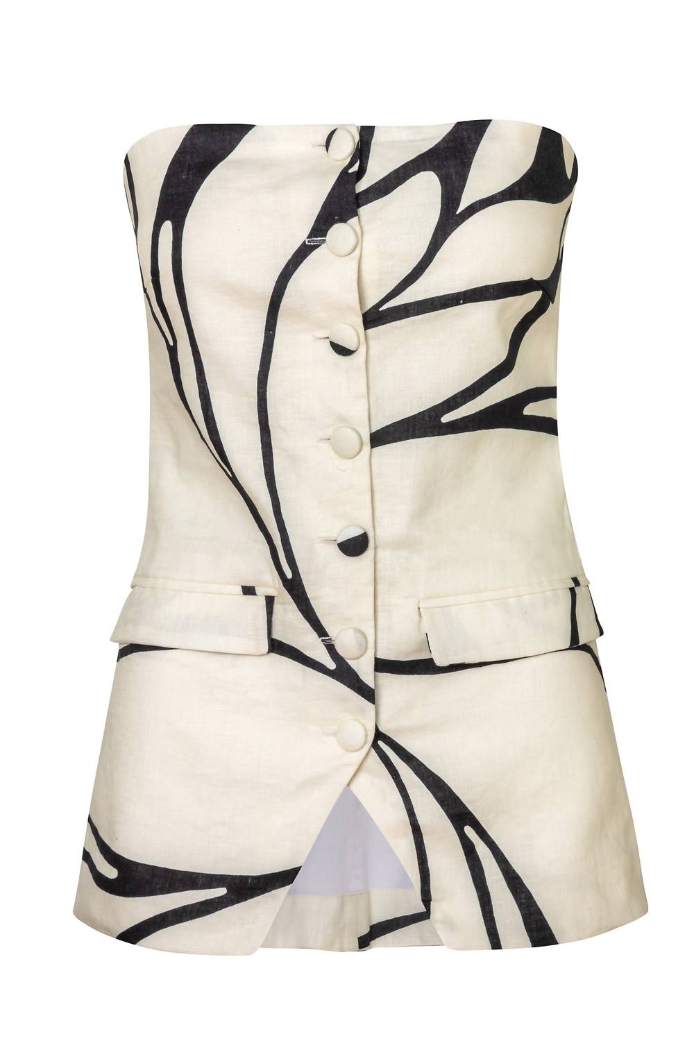 Throw this vest over an all black outfit for a perfectly polished look. Elevate your wardrobe with the Noah Vest by Cala de la Cruz, a strapless masterpiece in a sophisticated abstract black pattern on a white background. Crafted from 100% linen and expertly made in Colombia, this vest boasts a fully lined interior for a flawless fit. It features buttons and practical flap pockets, adding functionality to style. Closure: Button closure. Care: Dry clean only; do not rub, twist, machine wash, or tumble dry; iron at low temperature (max. 110°C).