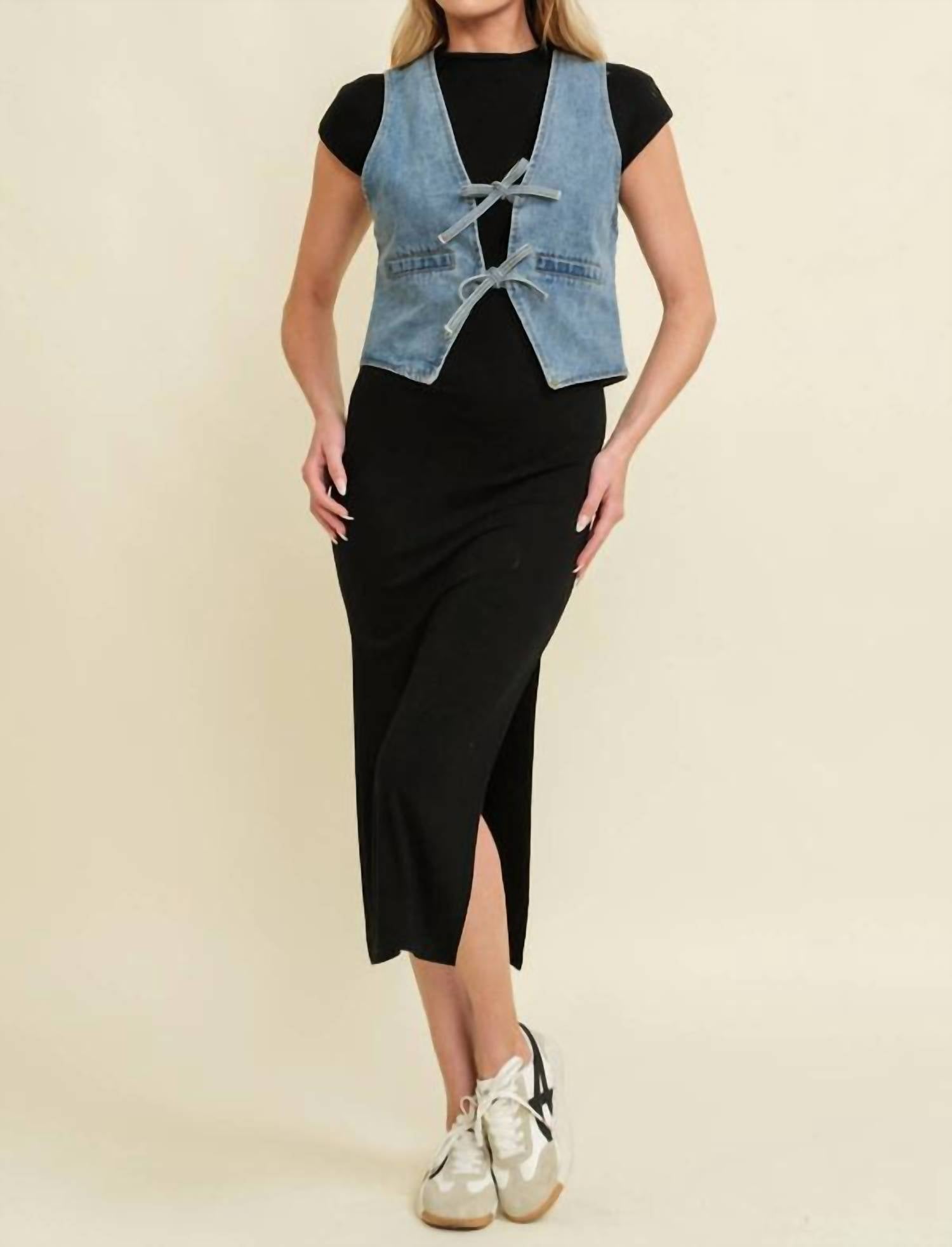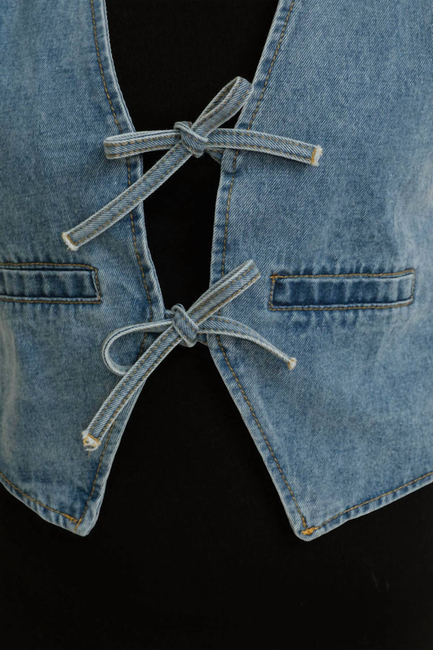 A vest so versatile you can mix and match it with almost any outfit and it will feel brand new every time. Introducing the Tie Front Vest by Cloud Ten, a chic addition to any wardrobe with its sleeveless design. Crafted from durable denim and featuring a trendy tie closure, this vest adds a touch of sophistication to any outfit. Perfect for layering, its classic denim wash ensures versatility and style. Whether you're dressing up for a night out or keeping it casual, this vest is a must-have.