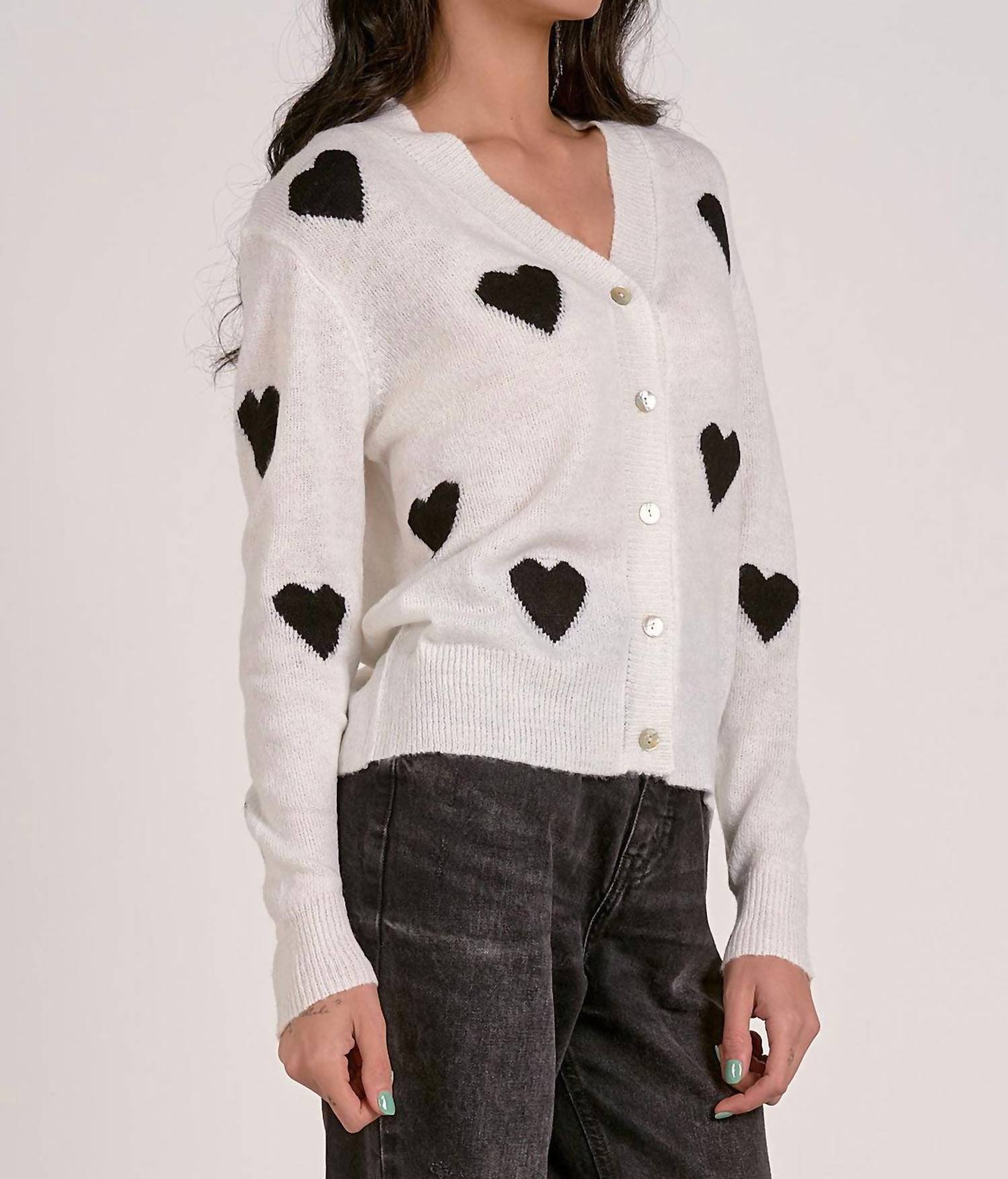 Introducing the ELAN Hearts Cardigan, a whimsical addition to your wardrobe with its playful black hearts design. This women's cardigan features long sleeves and a V-neckline, perfect for adding style to any vacation or fall occasion, including Valentine's Day. Made from a cozy blend of 70% acrylic and 30% polyester, it offers a soft knit feel. With a button closure providing easy layering, this graphic print piece in white and black promises comfort and charm.