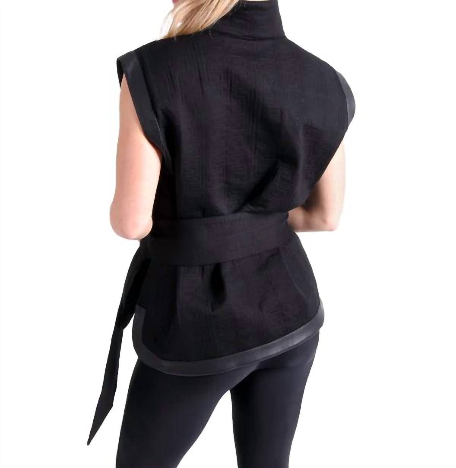 Throw this vest over an all black outfit for a perfectly polished look.This vest showcases a classic poppy style stand collar and fine embroidery detailing, complemented by a wide cinching waistband and vegan leather trim. It has a straight, slightly tailored body and fits true to size. Made from a blend of ponte and vegan leather (65% rayon, 30% nylon, 5% spandex), it is hand washable.