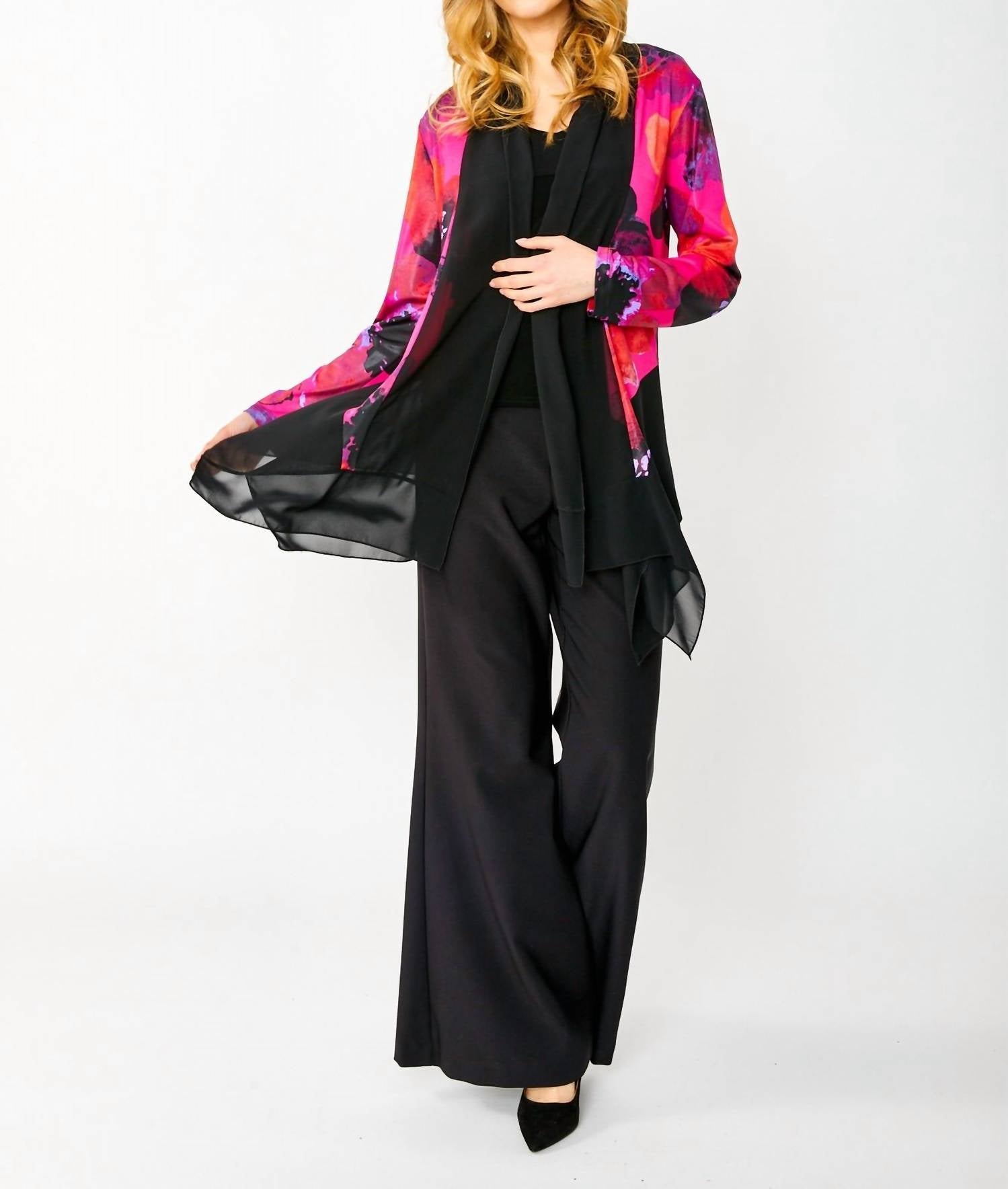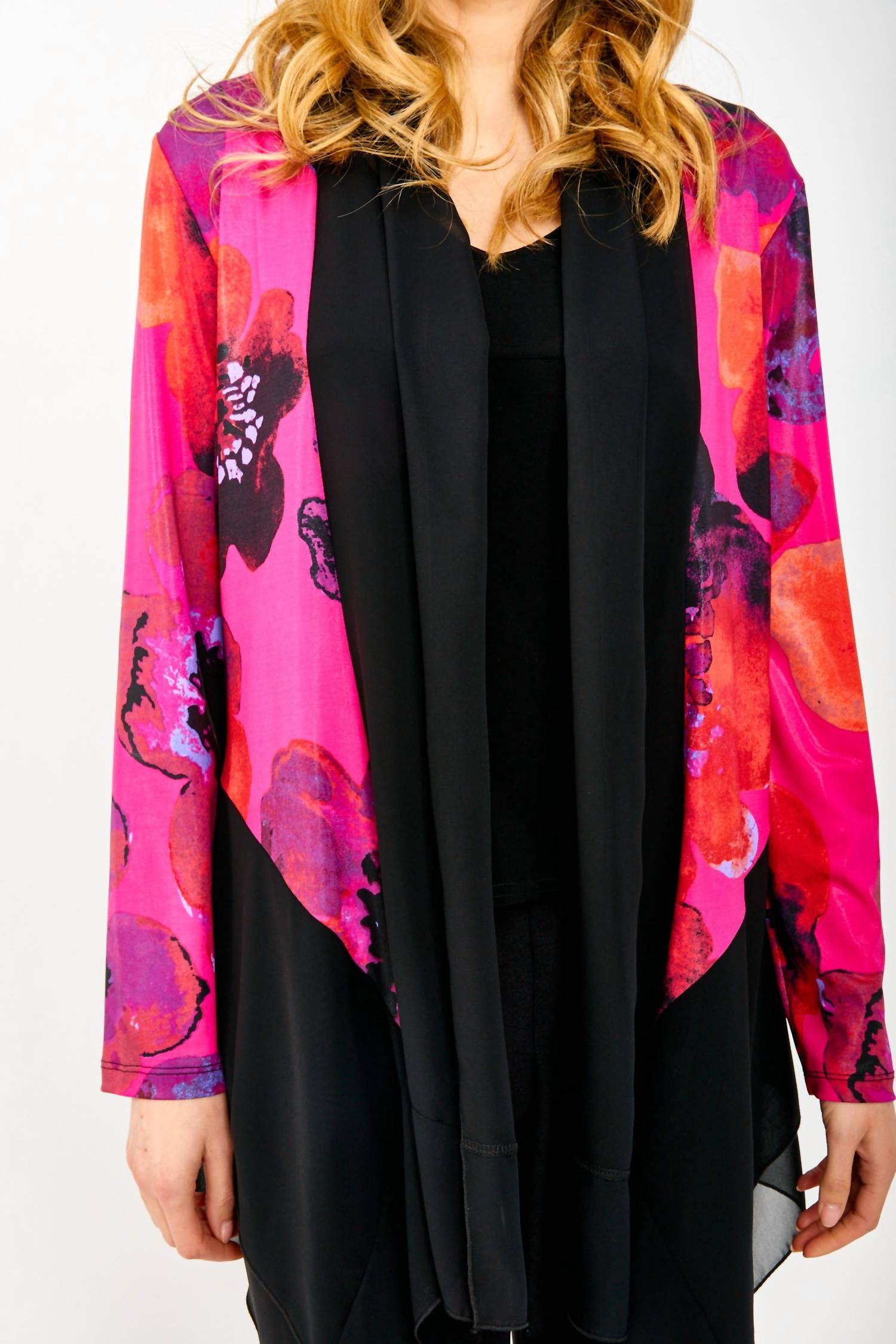 Introducing the Floral Sheer Jacket by Frank Lyman, a stylish must-have for women seeking flair in their wardrobe. With its long sleeves, this 33-inch length cardigan pairs a magenta and black floral pattern with a bohemian touch thanks to its open-front design and asymmetrical hem. Made from 95% polyester and 5% elastane, it's both lightweight and comfortable. Care for this unlined piece is easy: simply hand wash and lay flat to dry.