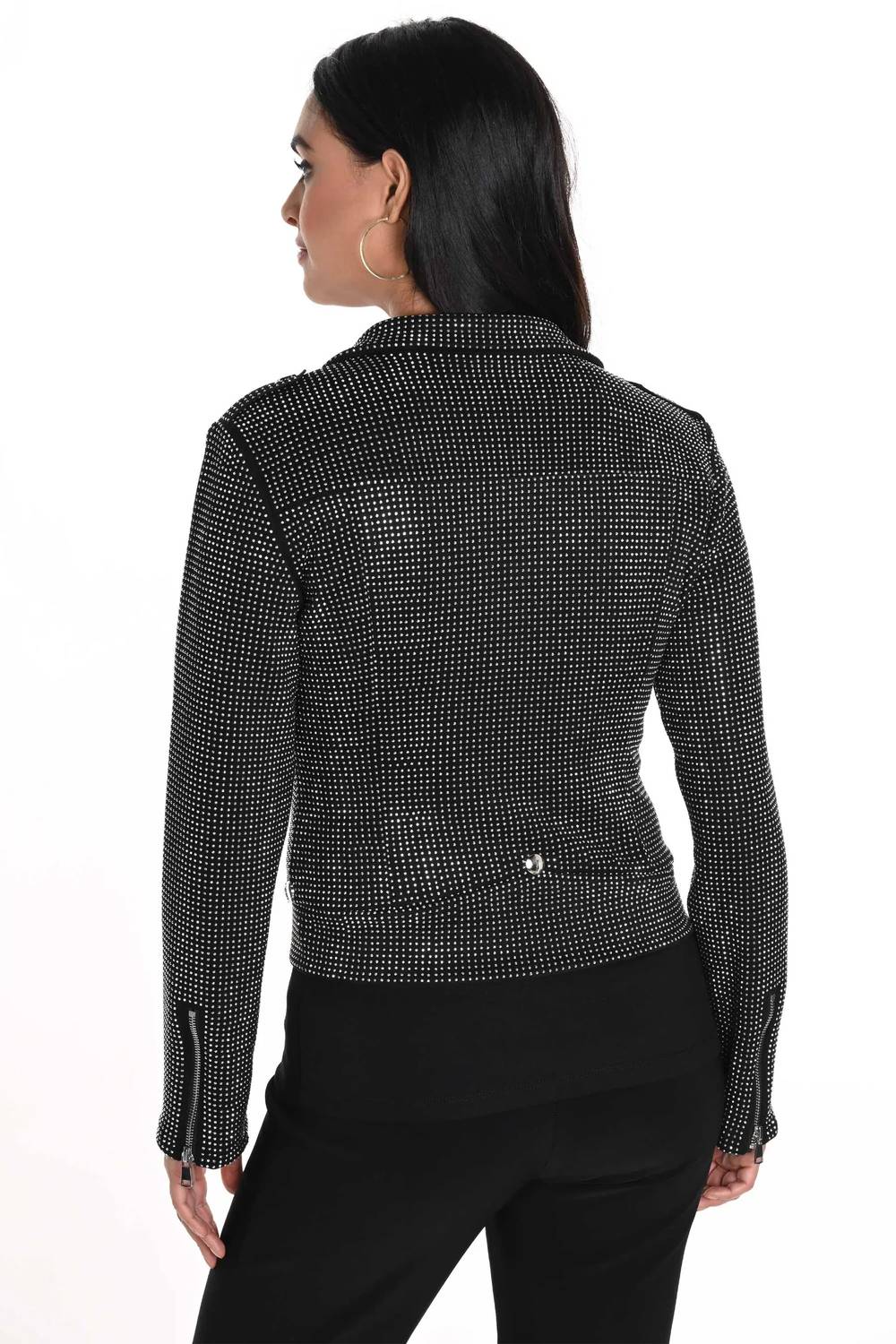 Meet the Frank Lyman Rhinestone Knit Jacket, a bold expression of style in a stunning black and silver combination. With long sleeves and a classic collar, this luxurious jacket is crafted from 92% Polyester and 8% Elastane. The design features a zip closure for easy wear, complemented by moto-bike style front zips and zip pockets, plus chic stud details. Ideal for elevating concert looks or celebrating New Year's Eve, its attention to detail is perfect for those who value craftsmanship and flair.