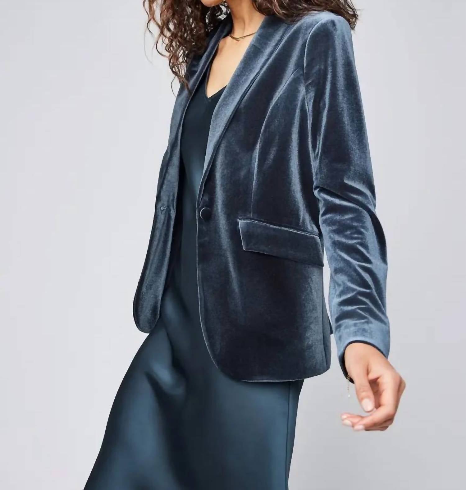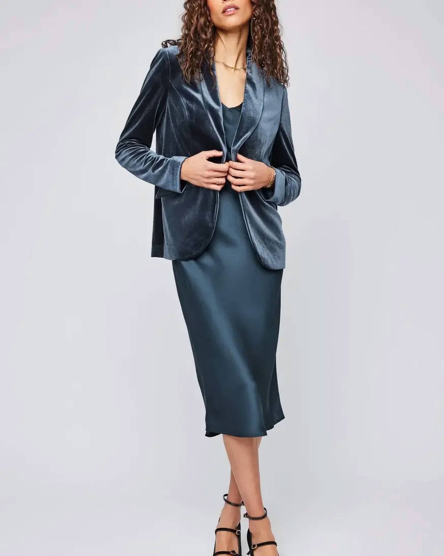 A blazer so versatile you can wear it to the office or pair it with jeans for a more casual look. Introducing the Gentle Fawn Caroline Blazer in a sophisticated Twilight hue, perfect for adding elegance to any wardrobe. This velvet blazer features long sleeves and a classic collar, crafted from a 92% polyester and 8% spandex blend for a polished, slim fit. It is fully lined and includes functional welt pockets with flaps, secured by a front button closure. Care: Dry clean only. Models wearing size S.