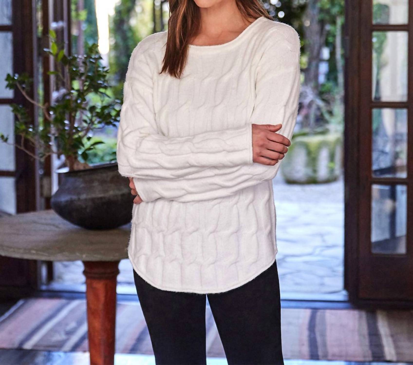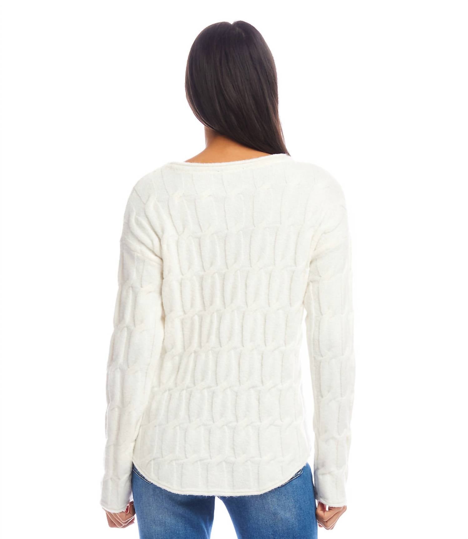 Throw this adorable cardigan over any cami or tank top. Elevate your fall wardrobe with the Karen Kane Cable Shirttail Sweater in sophisticated ivory. This women's cardigan features long drop shoulder sleeves and a stylish boatneck, crafted from a luxurious blend of 63% Recycled Polyester, 22% Acrylic, 6% Nylon, 6% Wool, and 3% Spandex. With an imported origin, its pull-on design and shirttail hem add to its chic look, measuring 25 1/2 inches for size M. Care for this textured piece by opting for dry clean only to maintain its quality.