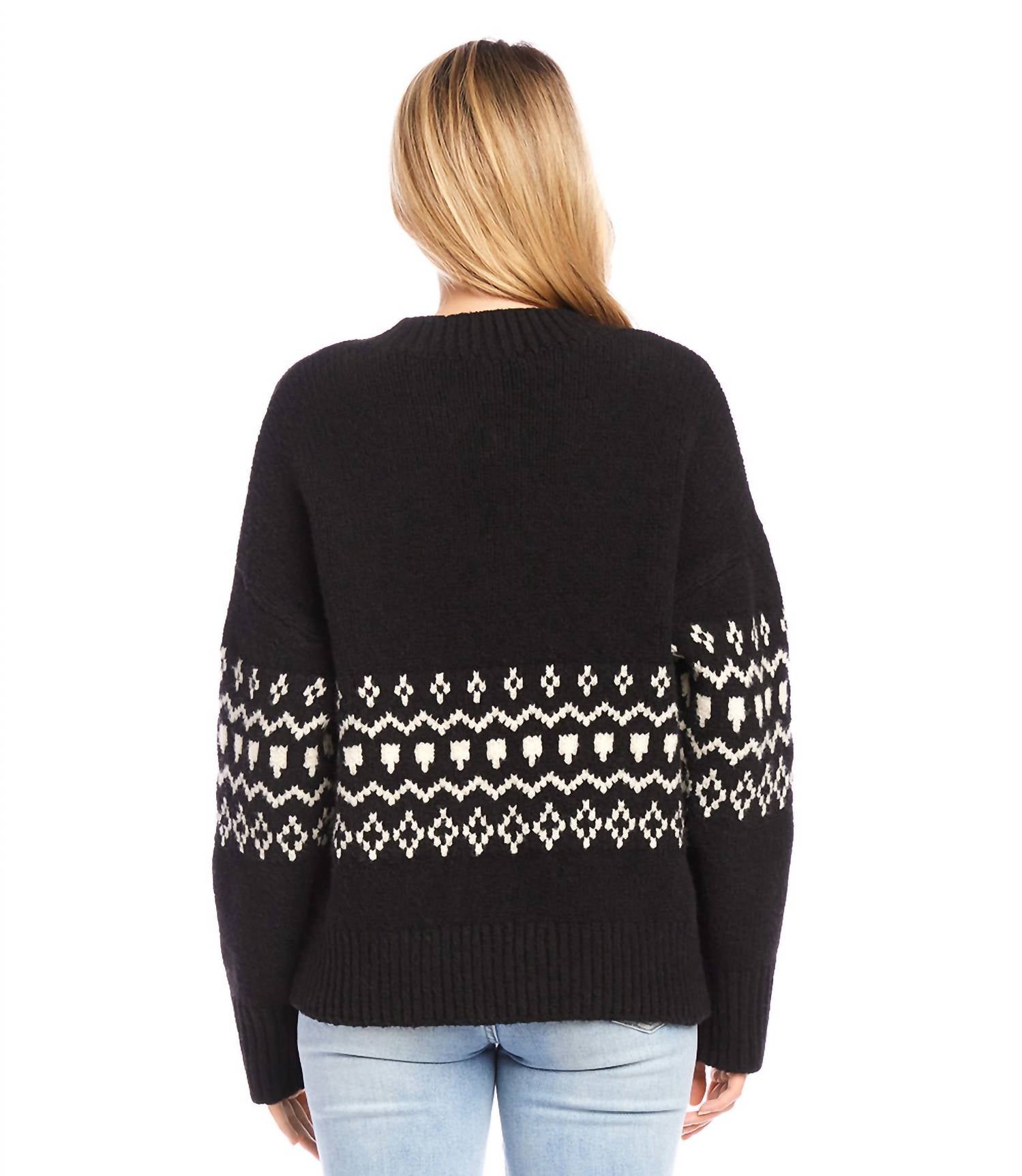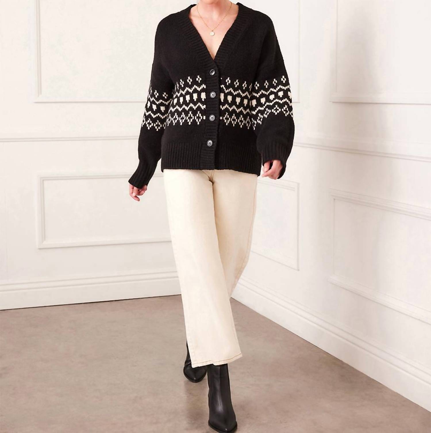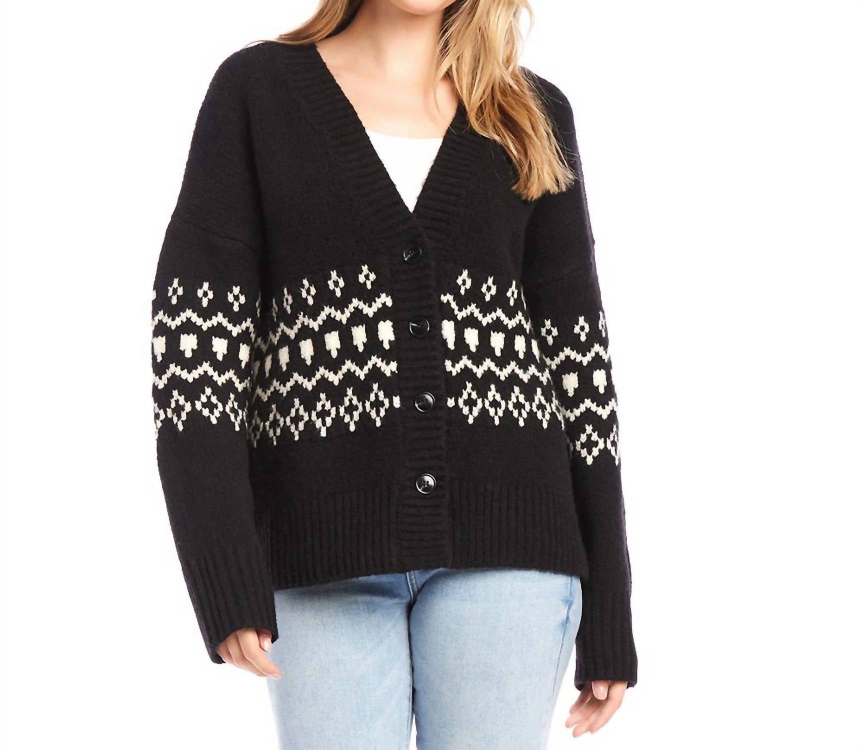 This cardigan will be a sweater-rotation favorite. Wrap yourself in elegance with the Jacquard Sweater Cardigan by Karen Kane, a chic addition to any wardrobe. Featuring long sleeves and a sophisticated V-neckline, this cardigan showcases a black and cream patterned design. Made from a blend including 52% recycled polyester and 6% wool, it provides both sustainability and warmth. Measuring 24 1/2 inches in length, this imported piece fastens with a button closure. Care for this piece with dry cleaning to maintain its luxurious appearance.