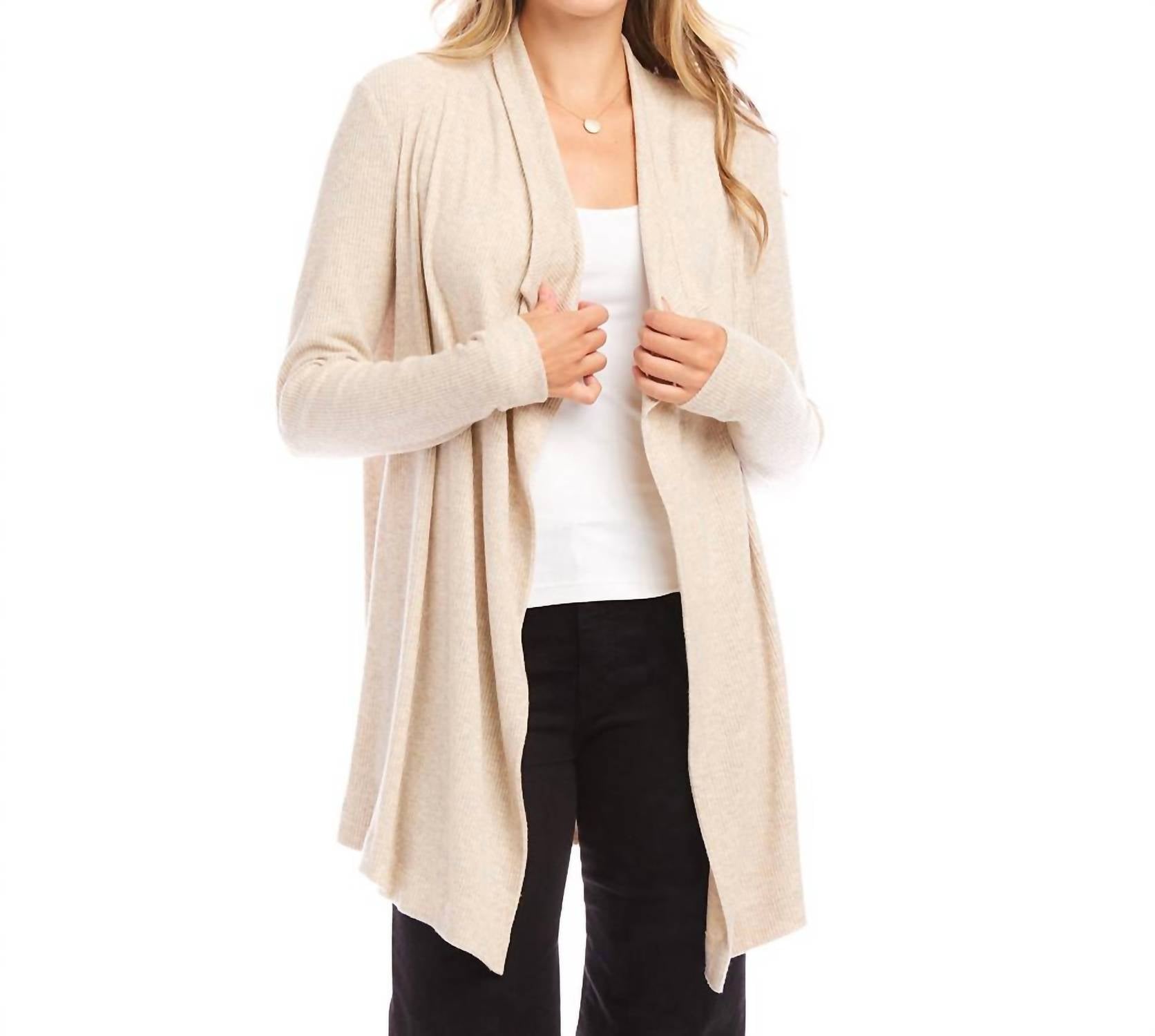 Throw this adorable cardigan over any cami or tank top. Meet the Ribbed Drape Front Cardigan by Karen Kane, the ultimate versatile piece for your dinner party ensemble. Crafted from a soft, brushed ribbed material, this women’s long-sleeve cardigan combines 96% viscose with 4% spandex for a stylishly warm fit. Length: 30 inches (size M). Origin: Made in the USA. Closure: Open front. Care: Hand wash in cold water, and lay flat to dry.