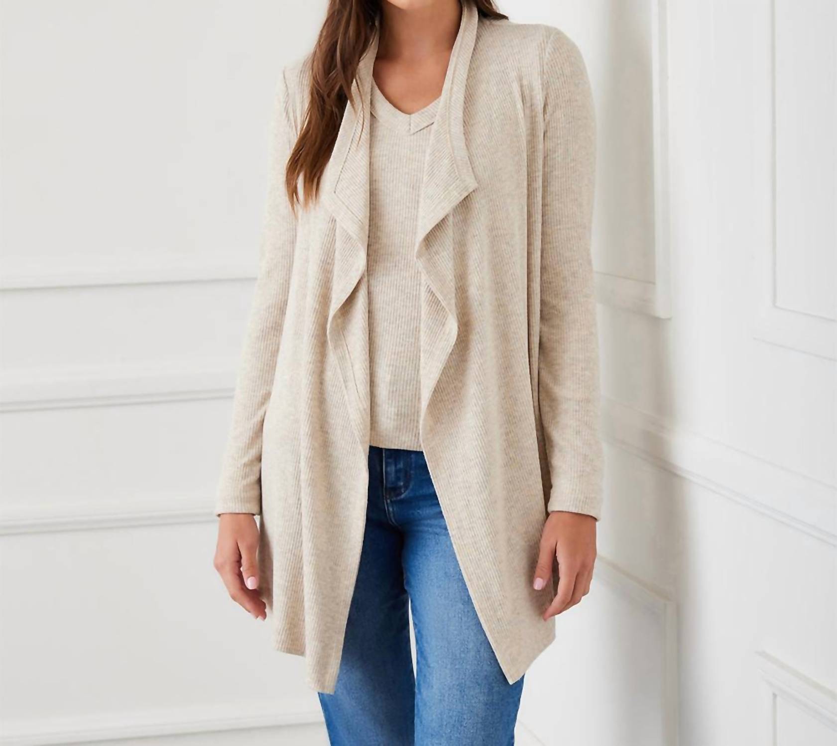 Meet the Ribbed Drape Front Cardigan by Karen Kane, the ultimate versatile piece for your dinner party ensemble. Crafted from a soft, brushed ribbed material, this women’s long-sleeve cardigan combines 96% viscose with 4% spandex for a stylishly warm fit. Length: 30 inches (size M). Origin: Made in the USA. Closure: Open front. Care: Hand wash in cold water, and lay flat to dry.