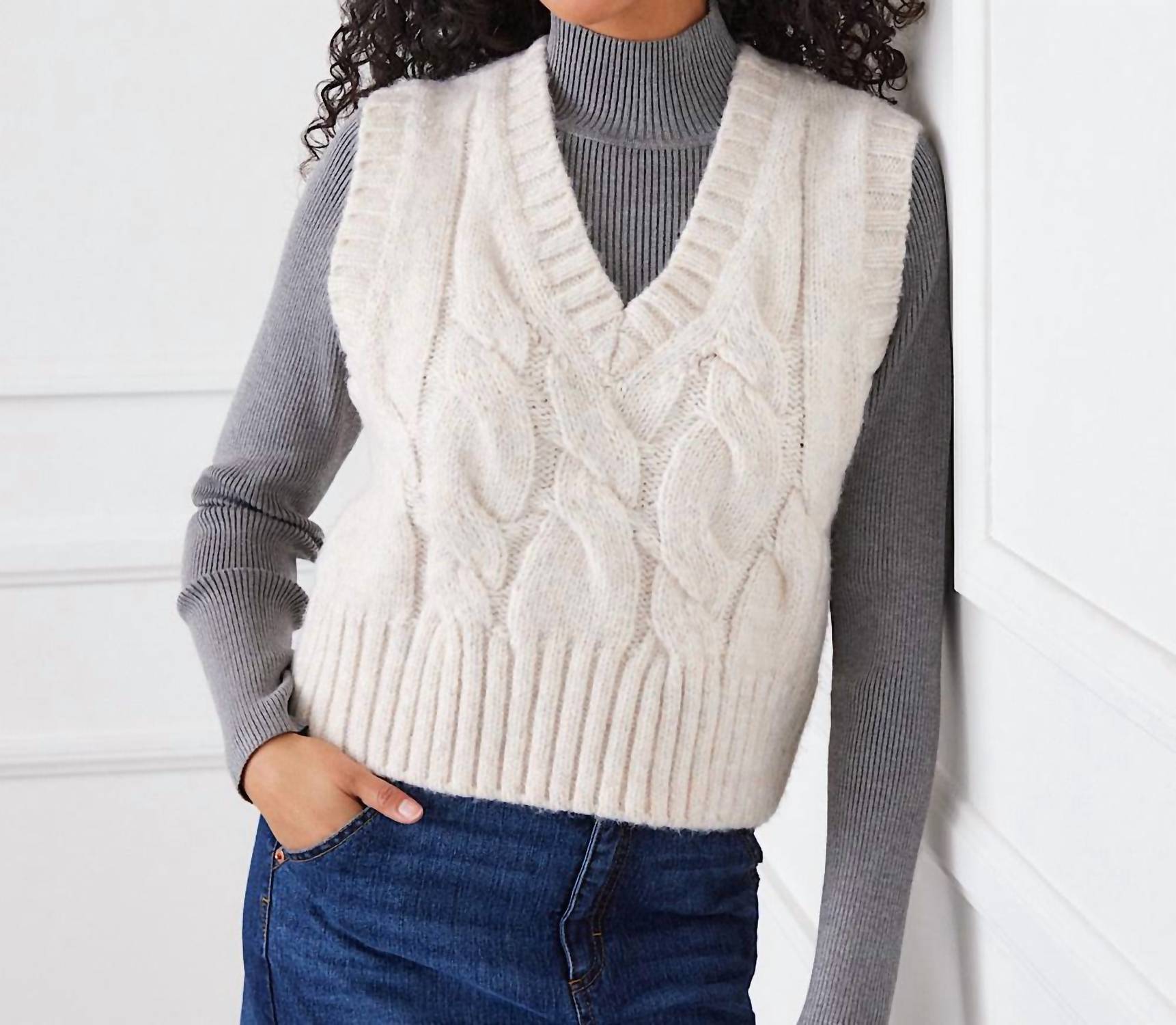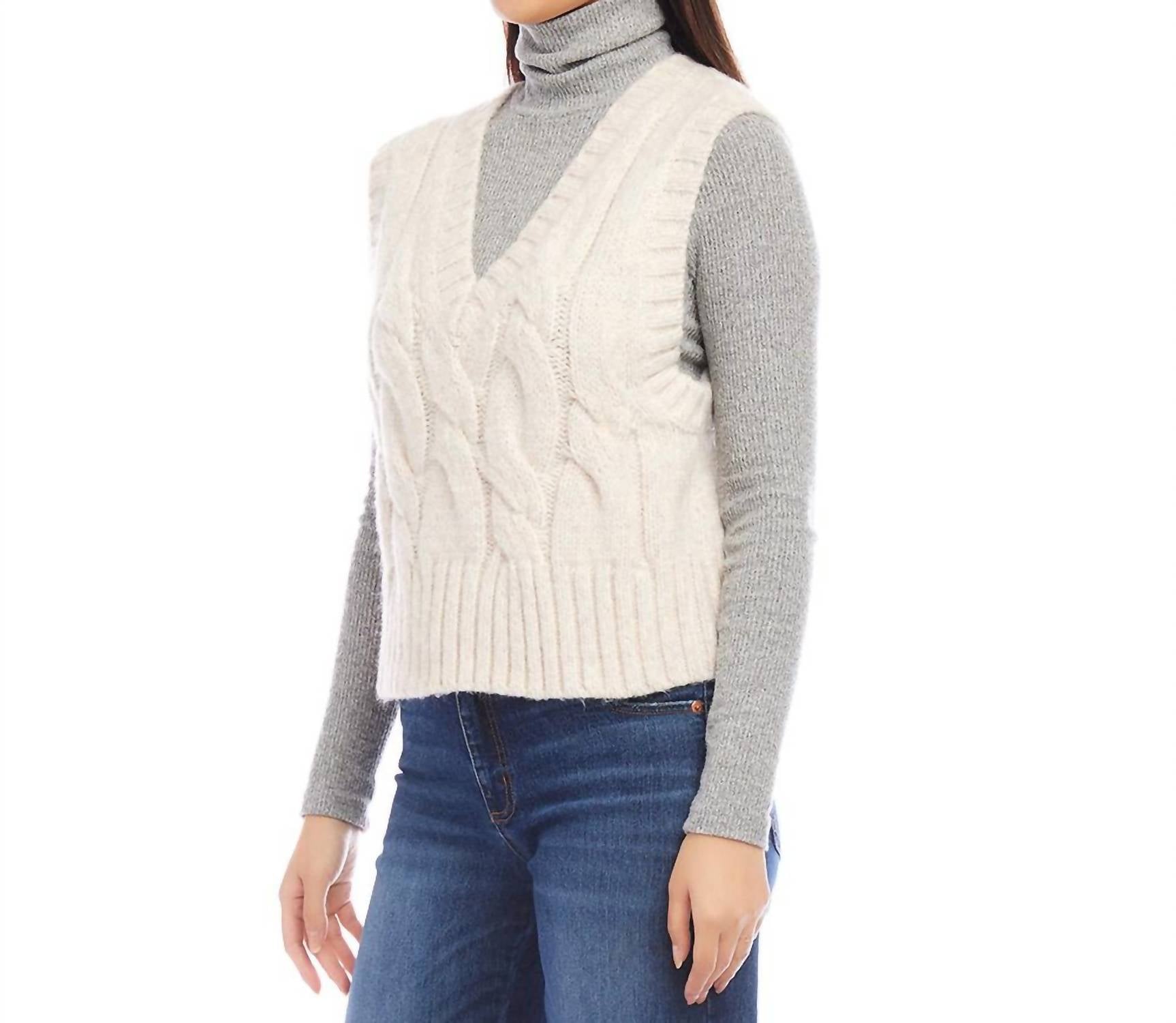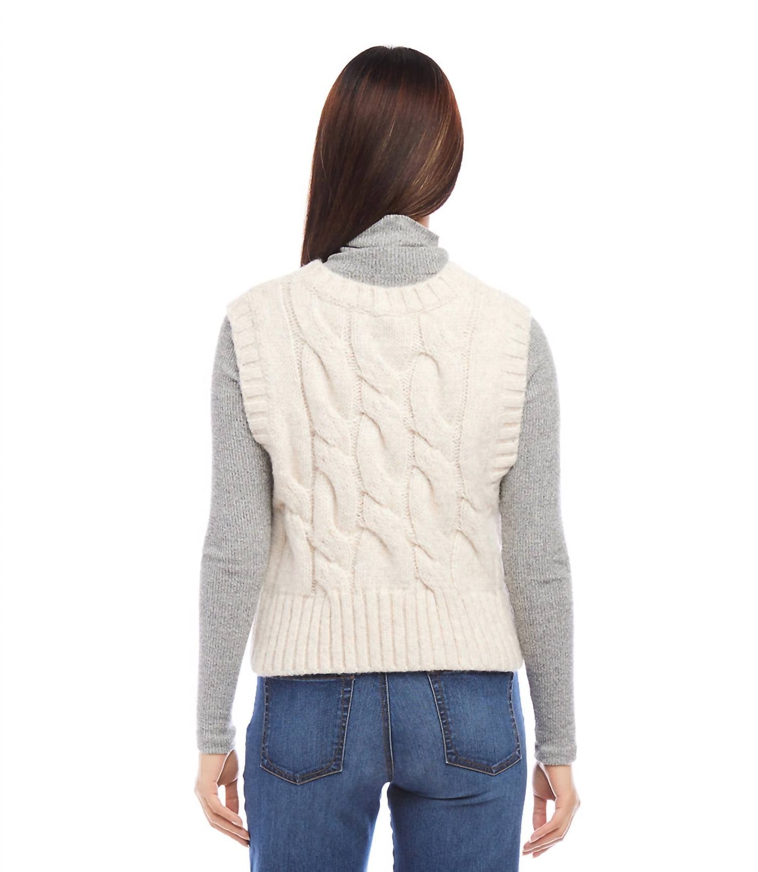 A vest so versatile you can mix and match it with almost any outfit and it will feel brand new every time. Elevate your spring wardrobe with the Karen Kane Sweater Vest in a textured beige design. Featuring a sleeveless, relaxed fit and crafted from a luxurious blend of 36% polyester, 33% recycled polyester, 20% acrylic, and 11% nylon, it's designed for both style and comfort. With a pull-on closure and a chic V-neck, this imported vest seamlessly combines warmth with a fashionable edge, emphasized by contrast wide ribbed details. At a length of 20 1/2 inches for size M, it’s the perfect piece for any dinner party occasion. Care: Dry clean only.