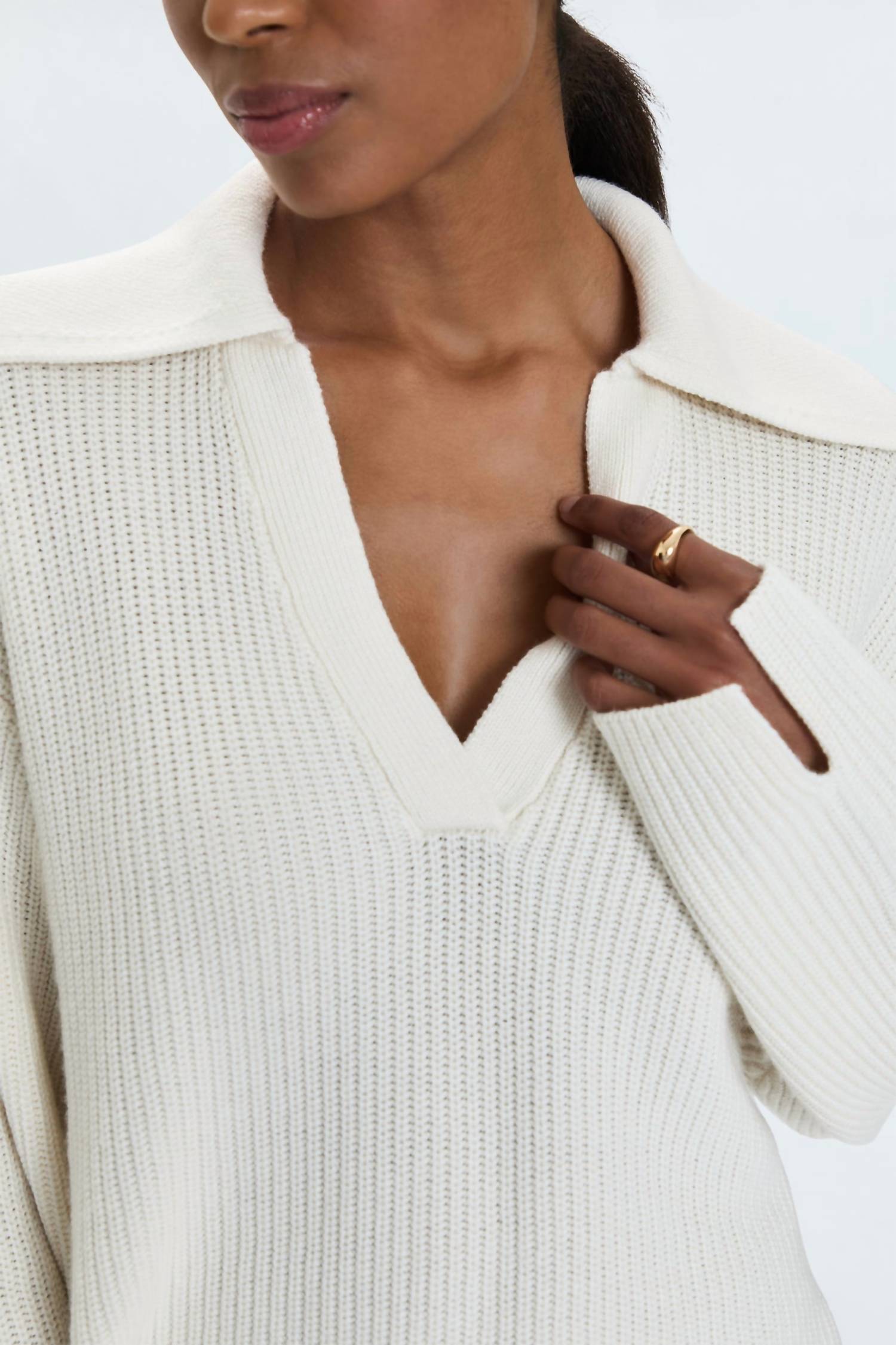 Meet the Darcy Big Collar Sweater by PISTOLA, a stylish women's cardigan perfect for a winter concert. This long sleeve sweater, crafted in a soft viscose blend, features an exaggerated open collar and a textured pattern in a shell color. It measures 21 inches in length and is imported for quality assurance. Designed with a pull-on closure, it's a minimalist’s dream. Model is 5'9" wearing a size small.