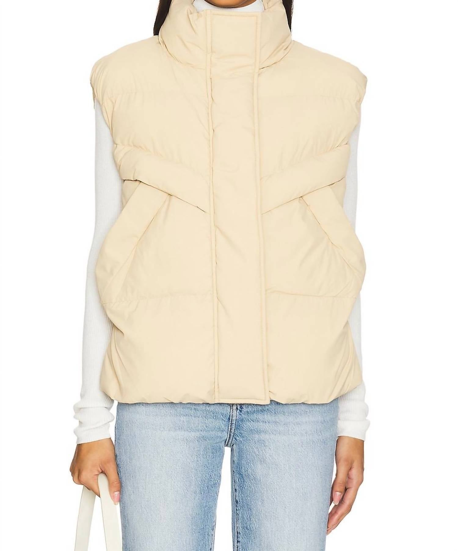 Experience cozy sophistication in the elegant Warm Sand hue. Sleeveless vest combines a 100% nylon shell with a 100% polyester lining and filling. Ensuring warmth and comfort. Made in China. Features a concealed front zipper with a snap button closure for a sleek finish. Practical slanted pockets. Care is hassle-free with machine wash compatibility.