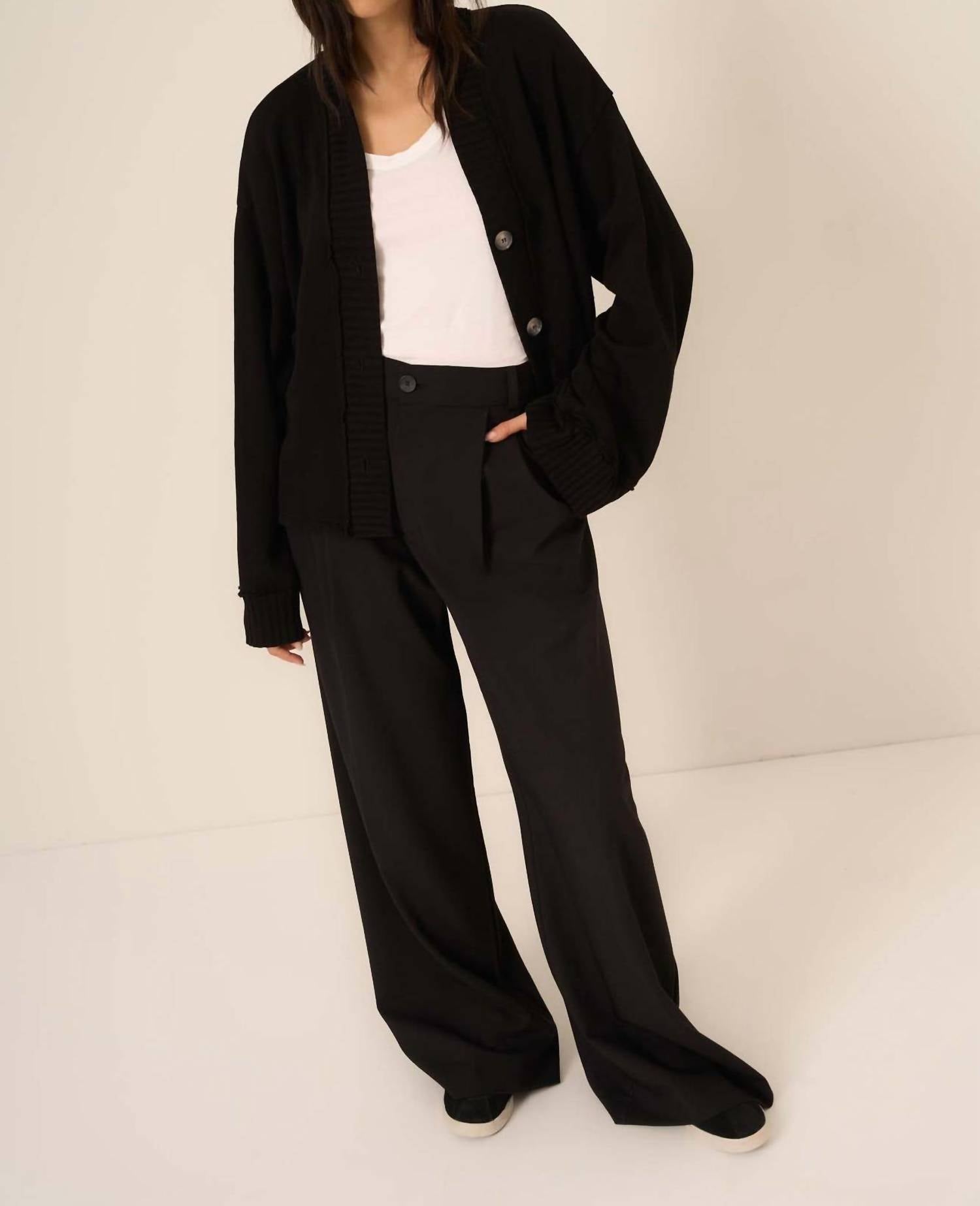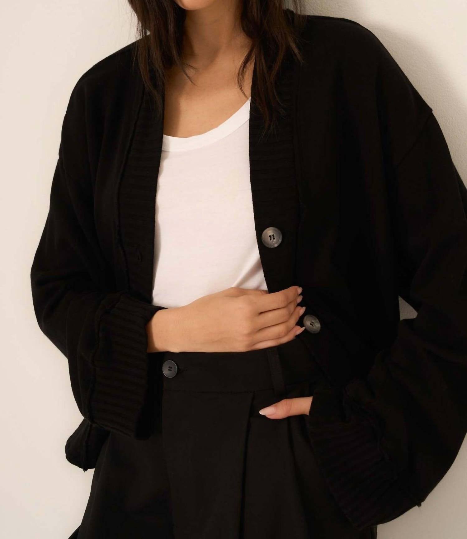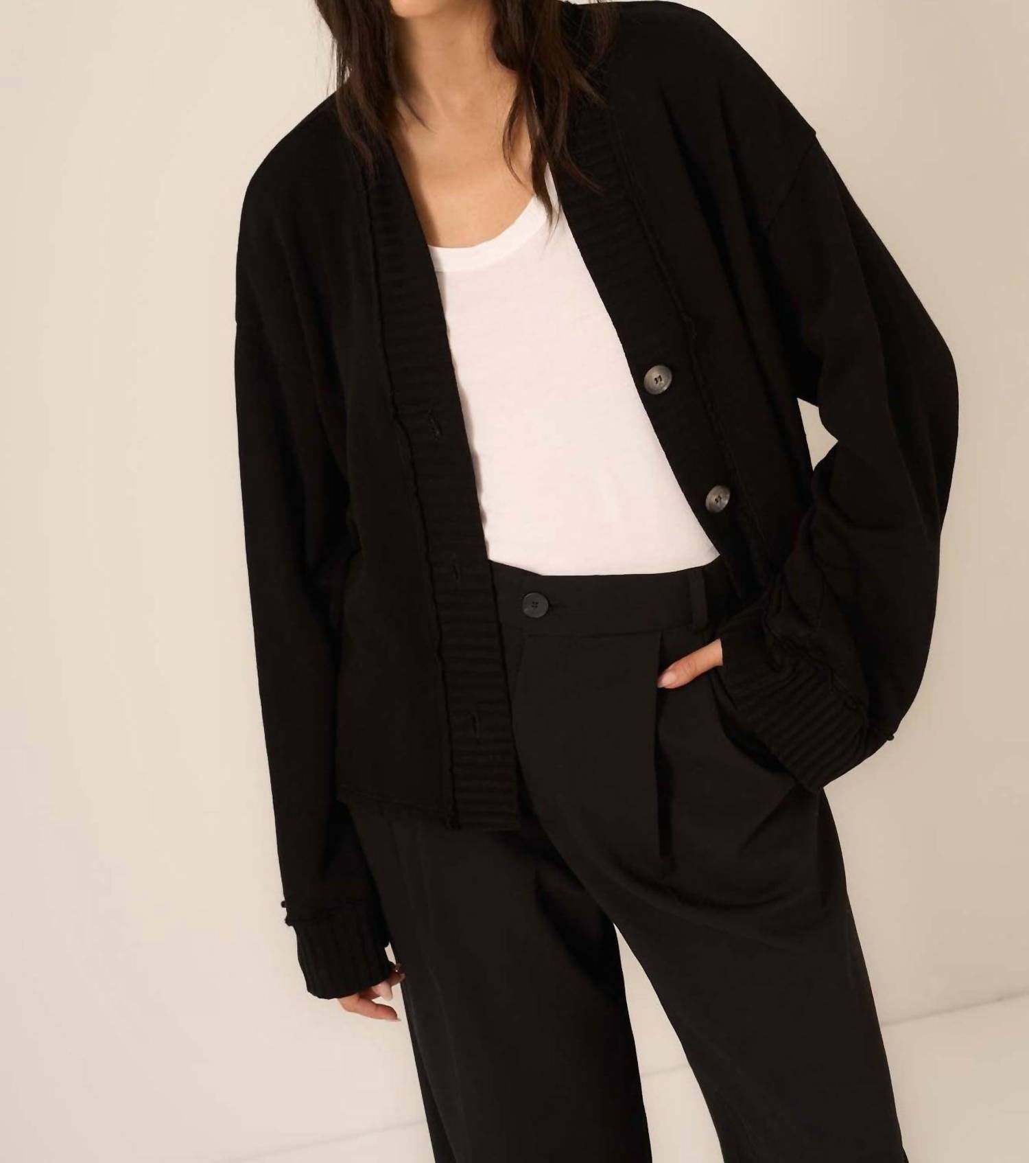 A classic fit that works just as good buttoned as it does left open. Elevate your wardrobe with the Romy Button Front Cardigan by PROJECT SOCIAL T, a chic addition in classic black. This cardigan is crafted from a cotton blend, featuring long sleeves, a stylish V-neckline, and a slouchy silhouette with raw detailing that exudes laid-back elegance. Its wide sleeves and drop shoulders offer a relaxed fit, perfect for layering. Closure: Button closure. Care: Machine wash, lay flat to dry.