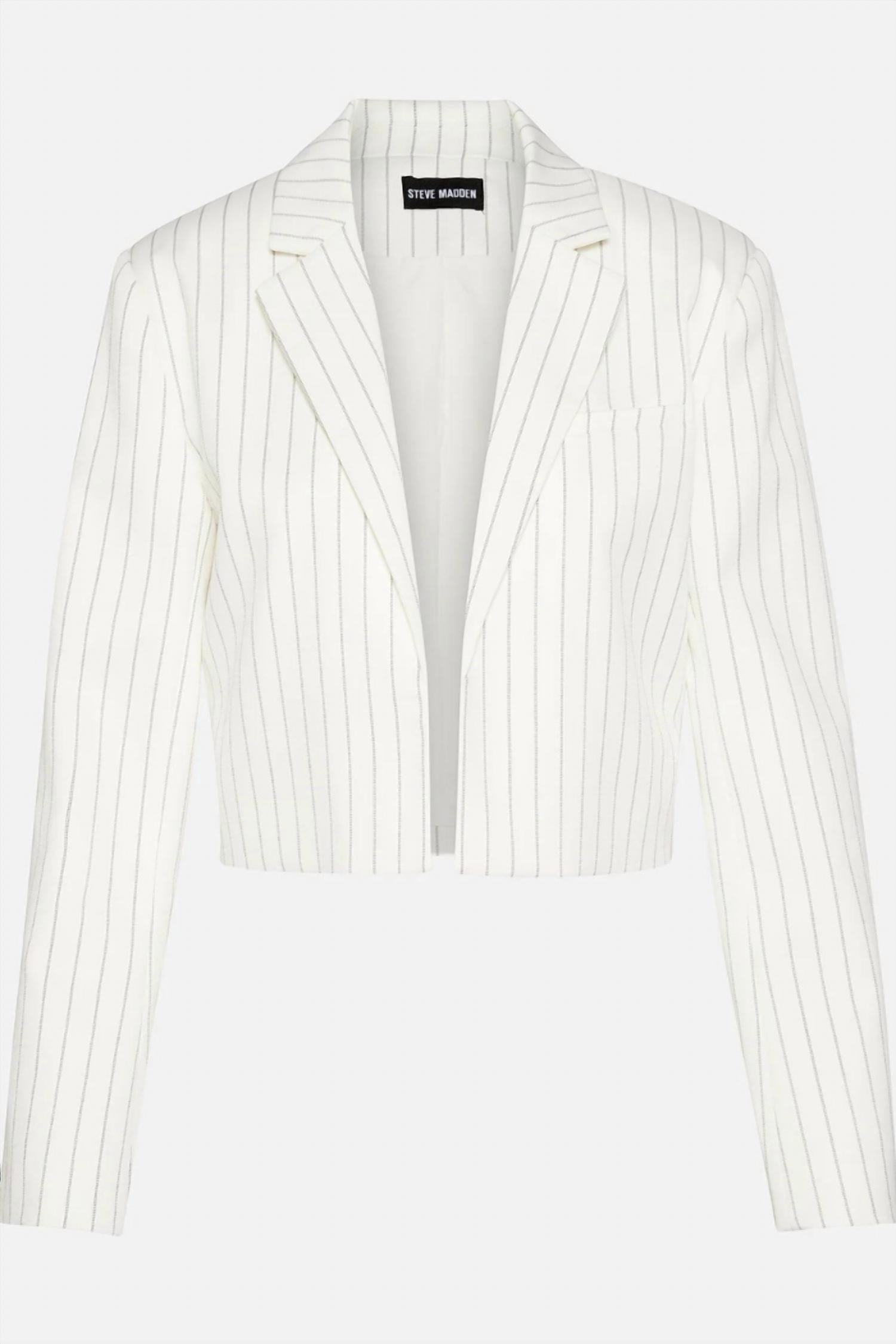 Introducing the Rupi Blazer by Steve Madden, a chic addition to your spring wardrobe in a classic cream pinstripe design. This menswear-inspired piece boasts long sleeves and a cropped length of 19.5" for a modern twist, crafted from a blend of 63% polyester, 35% rayon, and 2% elastane. The blazer is designed for effortless style with an open front, making it perfect for a smart casual ensemble. Care for this garment by hand washing cold separately, do not bleach, lay flat to dry, and low iron if necessary or dry clean.