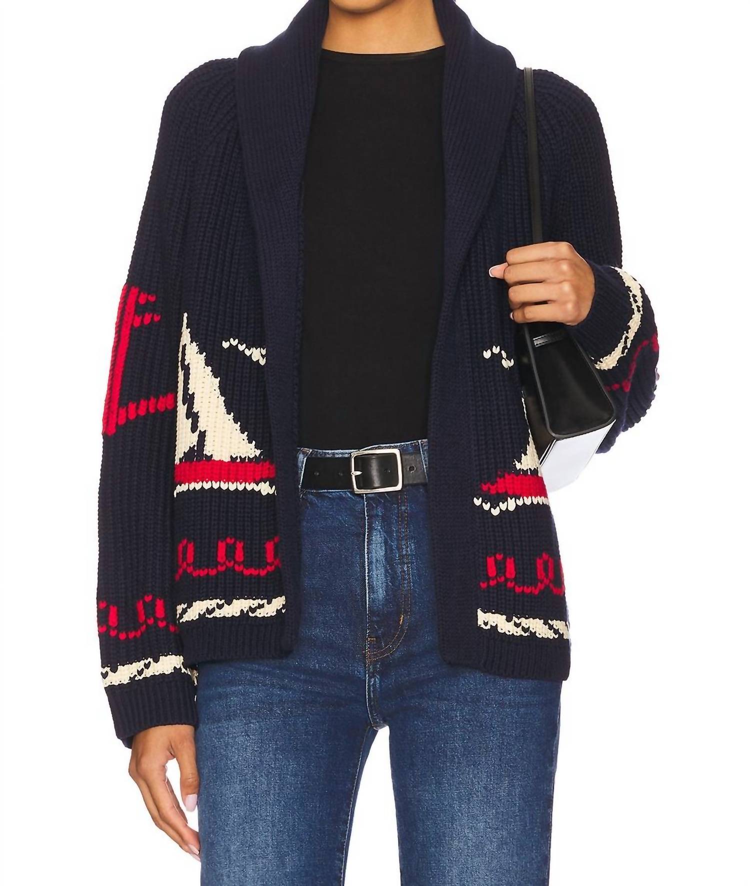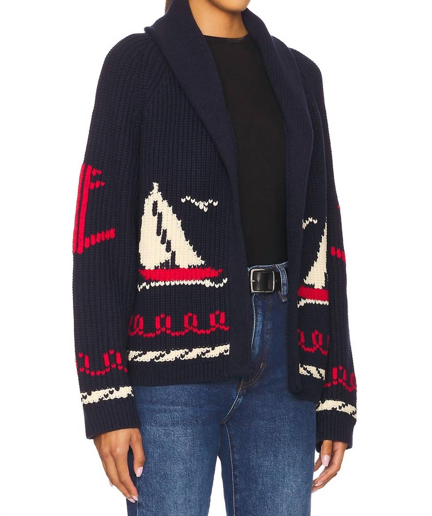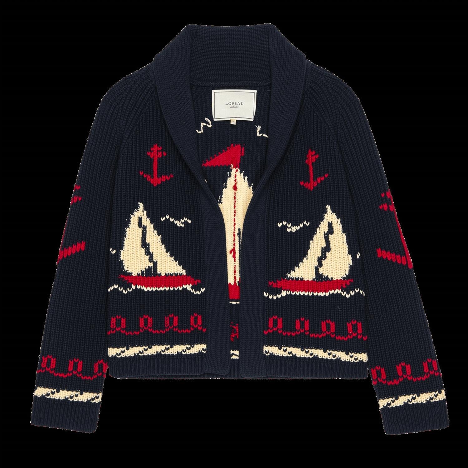 Throw this adorable cardigan over any cami or tank top. Introducing The Sailboat Lodge Cardigan by THE GREAT., a tribute to 1960s nautical charm in dark navy. This women's cardigan features long sleeves with hand-embroidered graphic boats and sailor motifs, adding a touch of maritime nostalgia. Made from a 60% cotton and 40% acrylic blend, it offers both comfort and style for fall occasions. Easy to wear and maintain, it comes with a pull-on closure and is machine washable with a tumble dry.