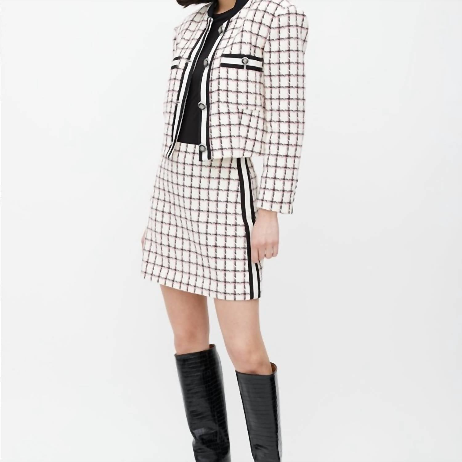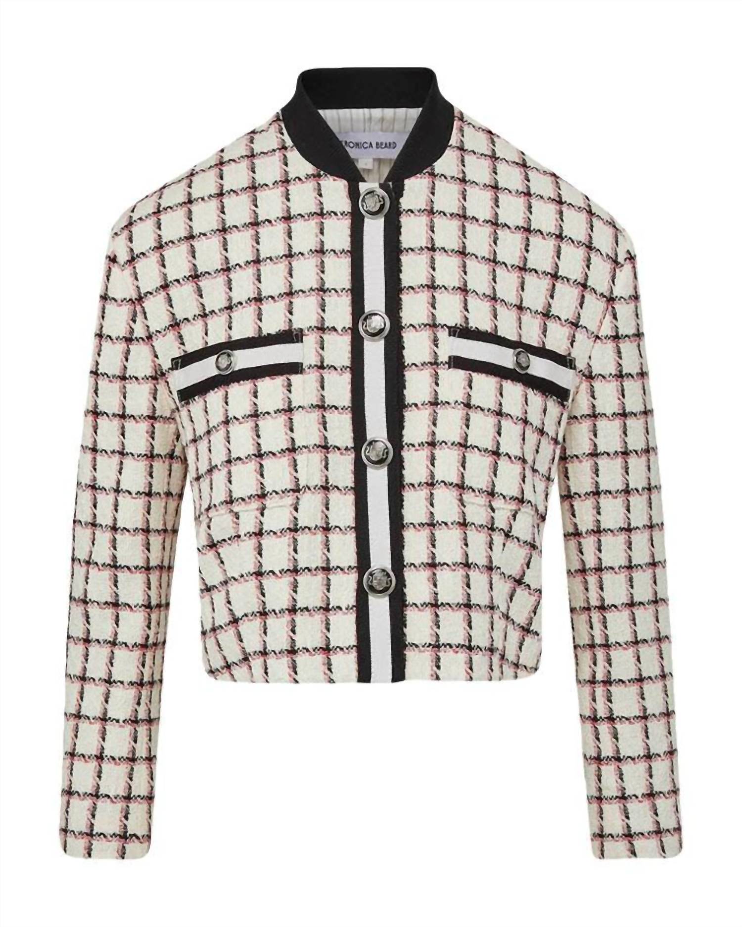 An elevated version of your favorite classic blazer. The Ellicot Jacket by Veronica Beard is an epitome of quiet luxury, perfect for evening events. Crafted with a cotton blend, this ecru multi plaid and check blazer features a sophisticated mockneck and functional pockets. Designed with long sleeves and a button closure, it's ideal for summer occasions, including Thanksgiving. With a focus on style, the jacket is unlined and easy to pair with a variety of outfits.