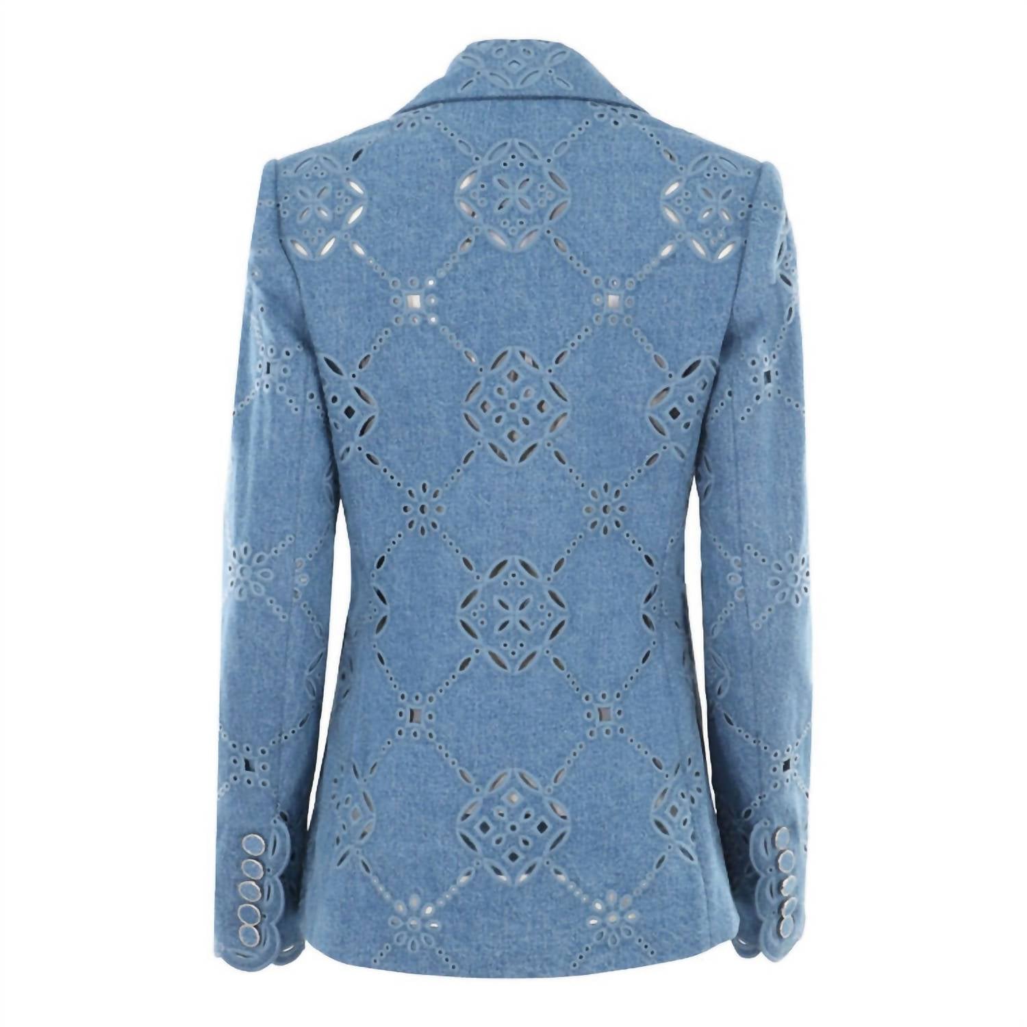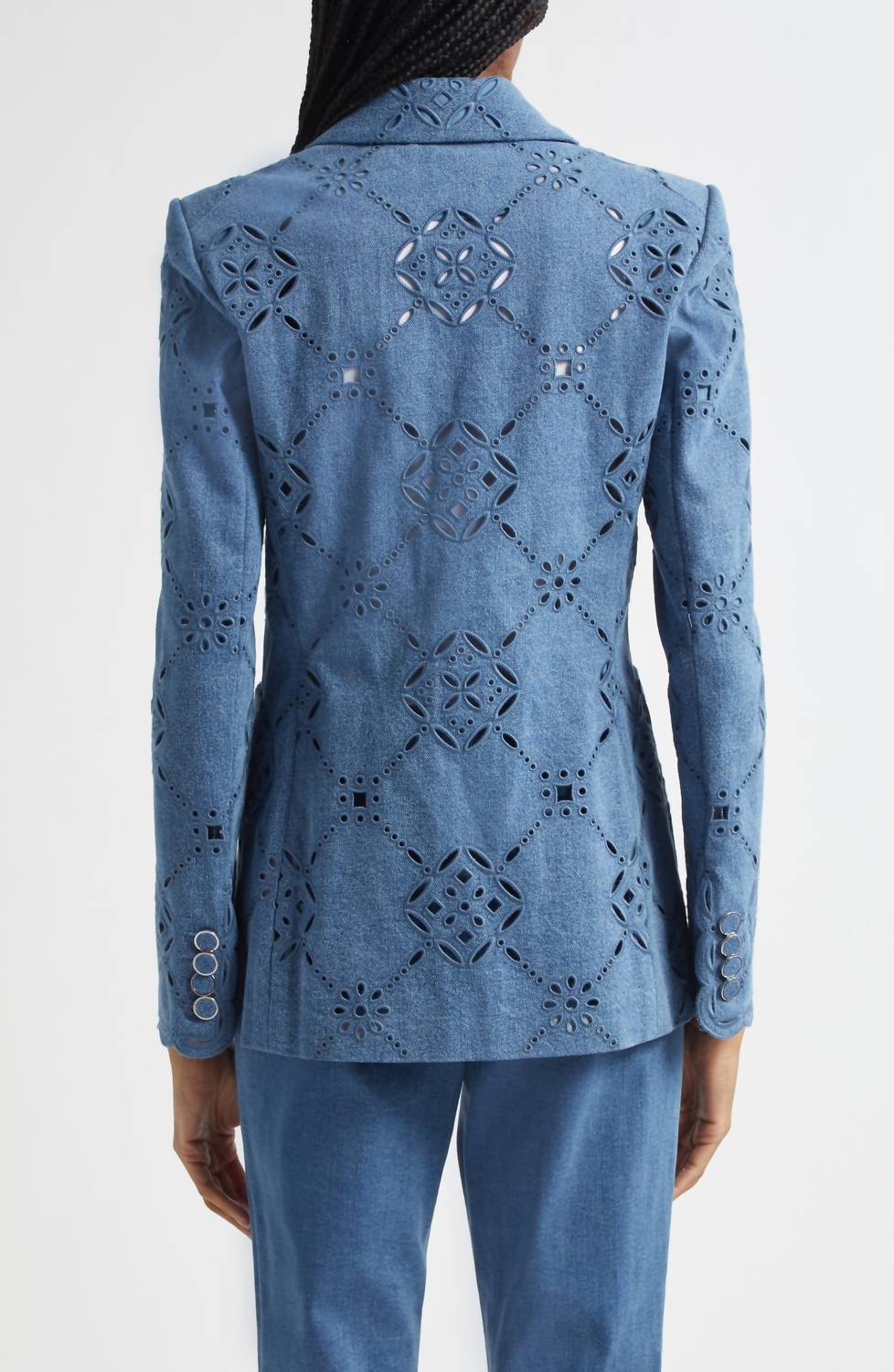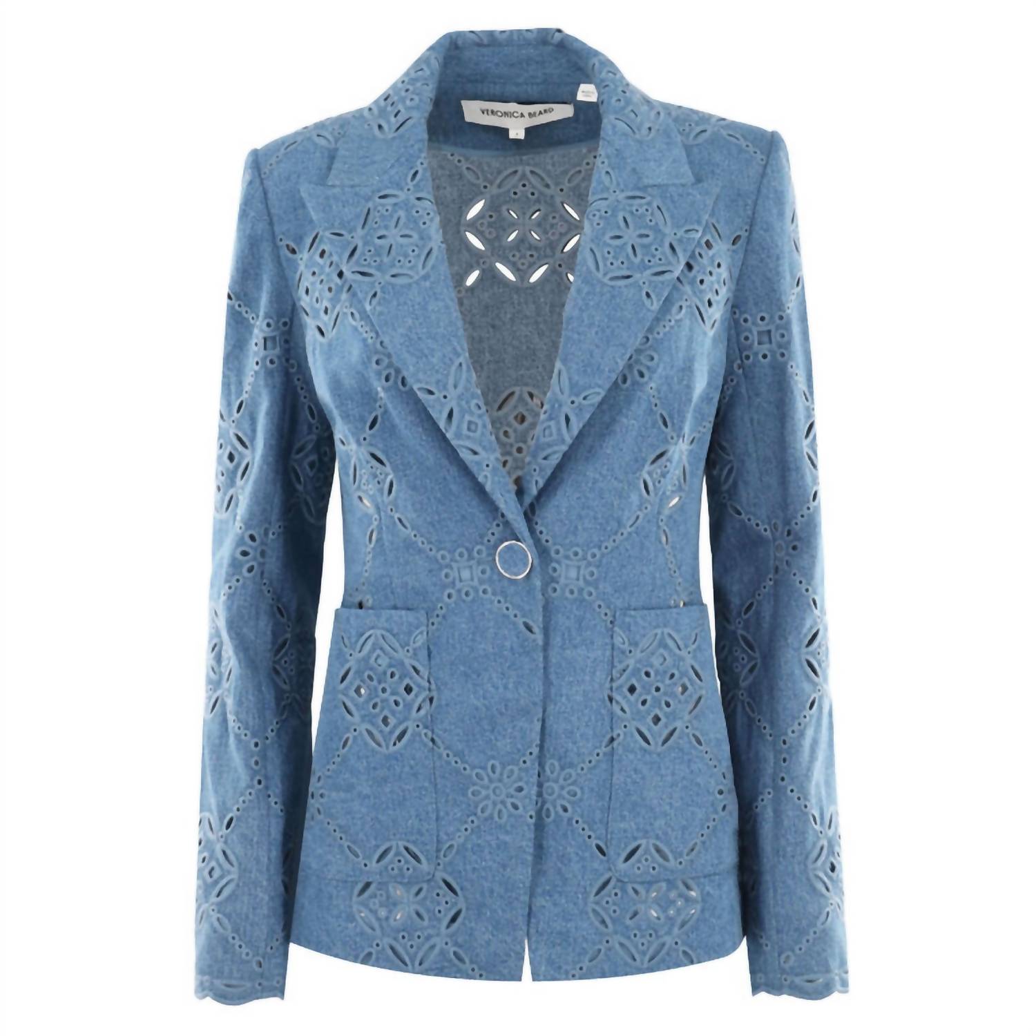 An elevated version of your favorite classic blazer. The Veronica Beard "Naira" Jacket in Sea Glare offers a chic and tailored fit perfect for elevating any look. This long-sleeve denim jacket features intricate eyelet embroidery, a peak lapel, and scalloped cuffs, with a single-button closure for a sophisticated finish. Front patch pockets add functionality, while its cotton composition ensures comfort and quality. Imported from China, this jacket requires dry cleaning to maintain its pristine condition.
