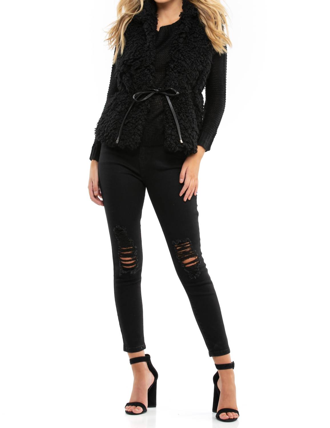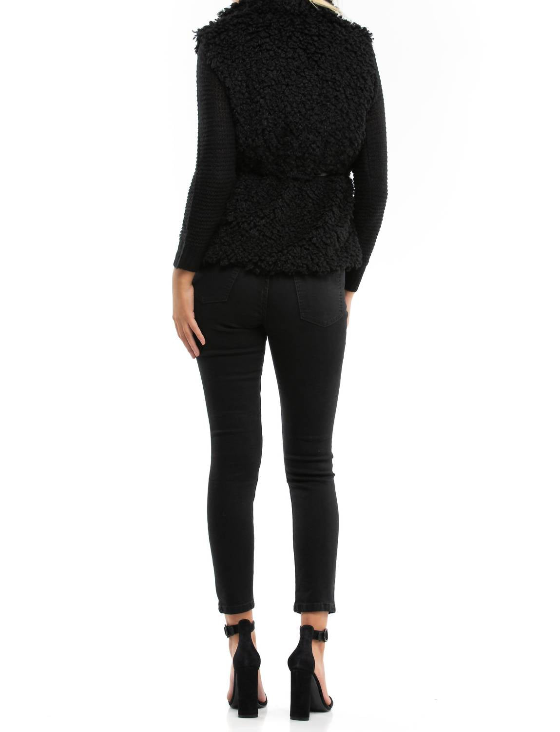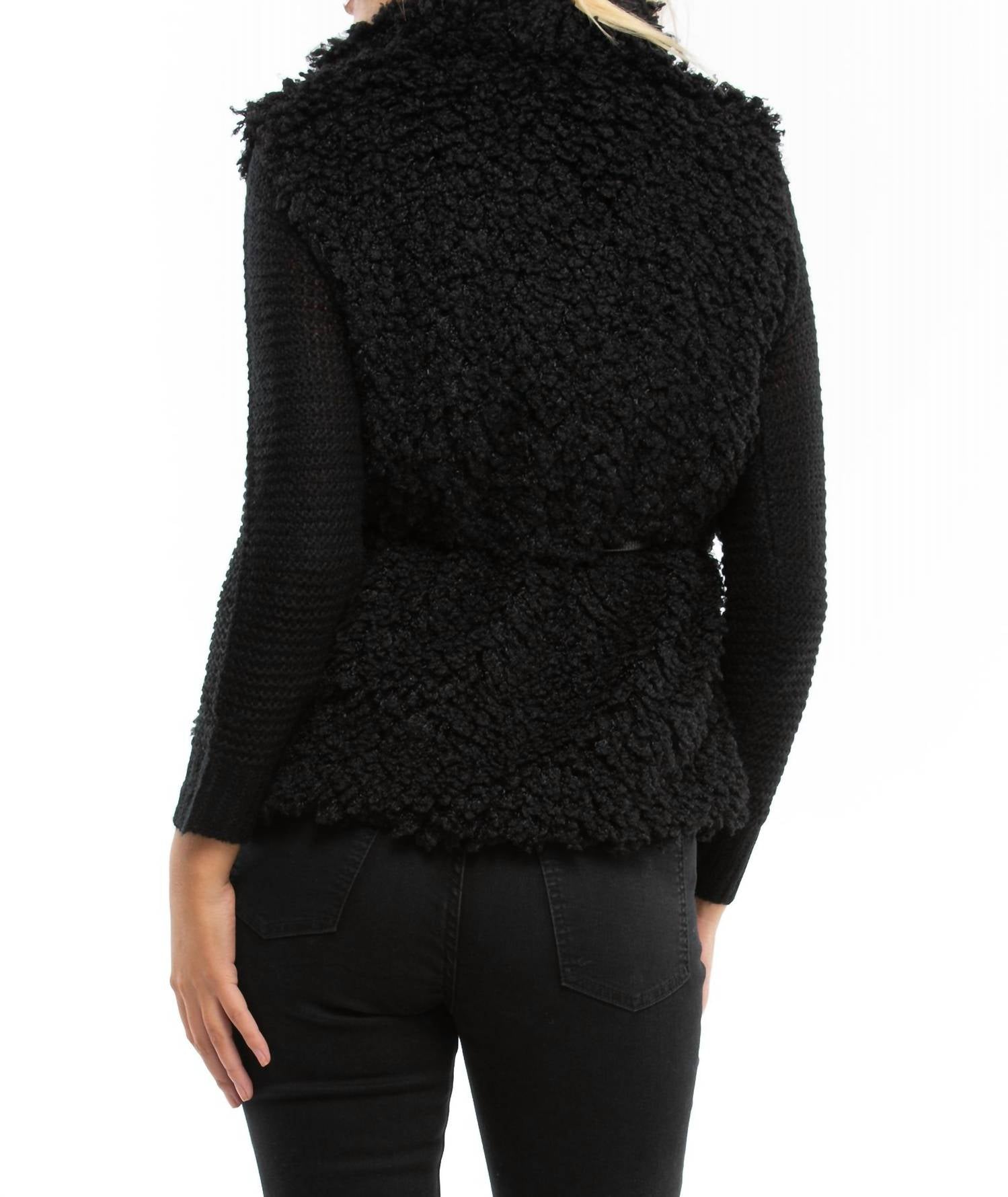 Throw this vest over an all black outfit for a perfectly polished look. Step into quiet luxury with the WYLDR Country Days Fluffy Gilet, a textured faux fur vest that radiates opulence. Designed with a sleeveless silhouette and a chic V-neckline, this fall-ready vest comes in a versatile black. Featuring a pull-on closure, it includes a removable faux leather belt for added style. Perfect for vacation outings, this fully lined piece combines comfort with sophistication, making it a must-have in your travel wardrobe.