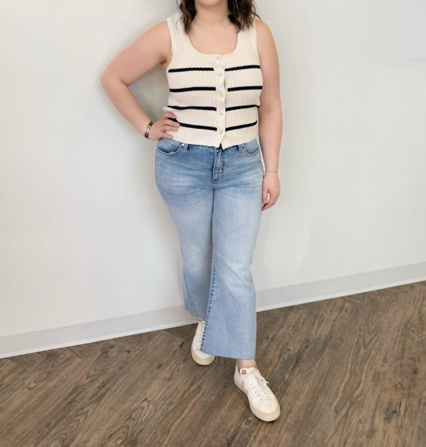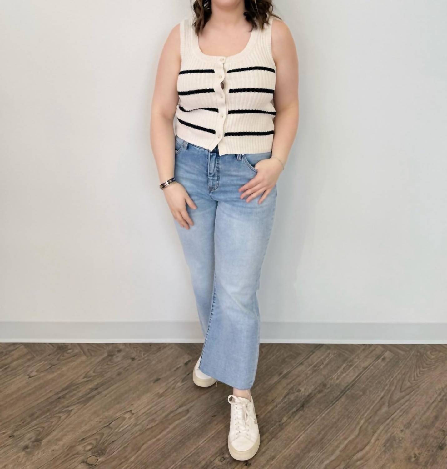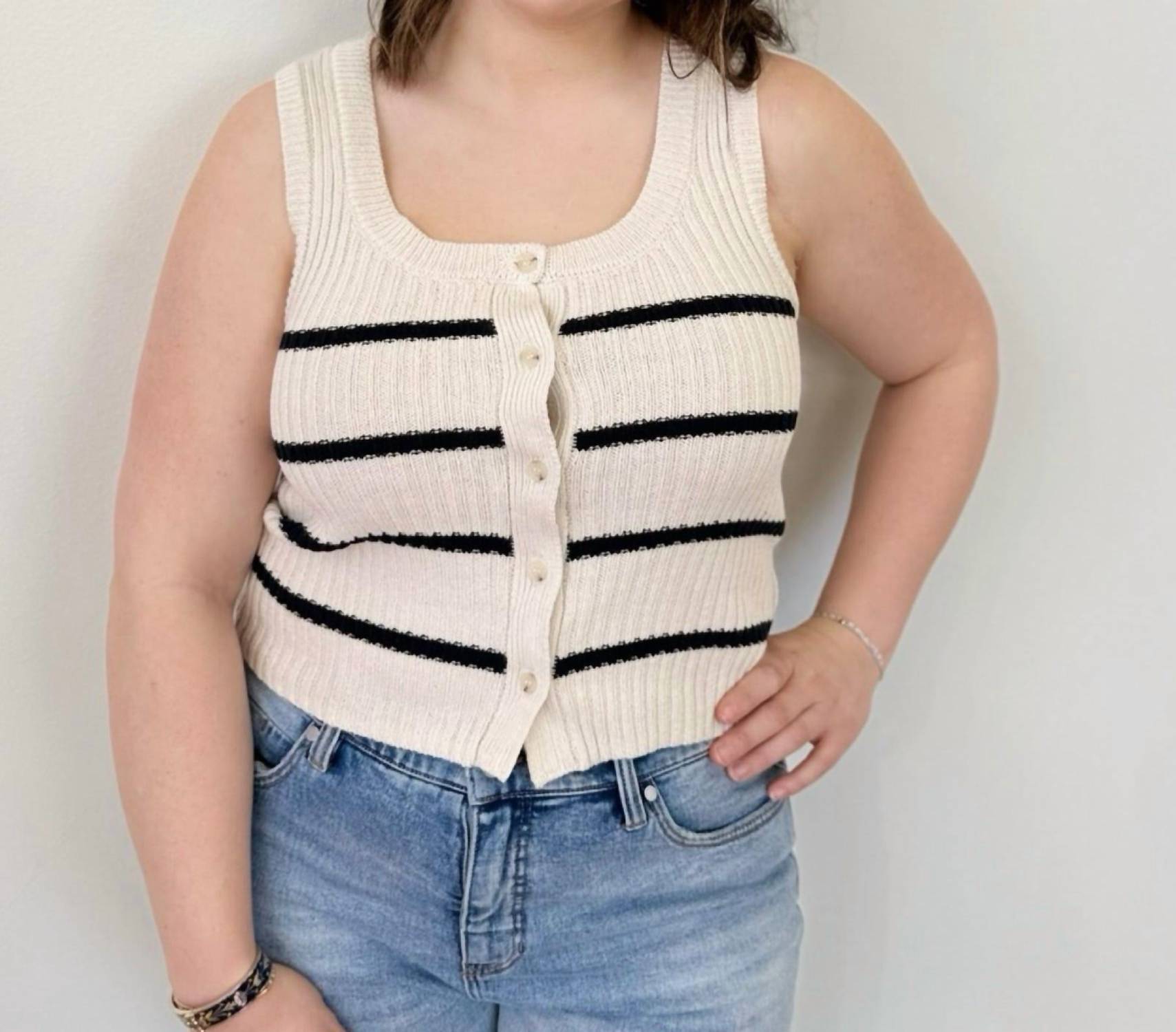 A vest so versatile you can mix and match it with almost any outfit and it will feel brand new every time. Timeless piece perfect for your spring travel wardrobe. Sleeveless vest, made from a luxurious blend of 80% cotton and 20% linen, features a stylish scoop neckline and bold striped pattern. Button closure. Hand wash recommended.