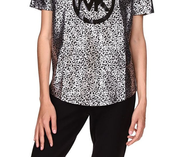A soft feel with an edge| this MICHAEL Michael Kors top is in organic cotton covered with a metallic signature print that elevates your T-shirt look.| Approx. 27 long| Crewneck| 100% organic cotton| Machine washable