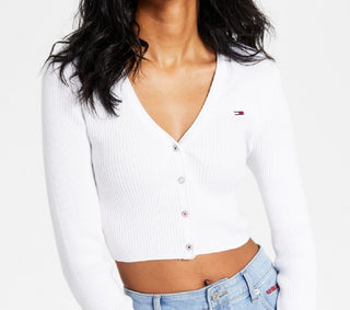 Tommy Jeans Women's Ribbed Cropped Cardigan White Size Medium